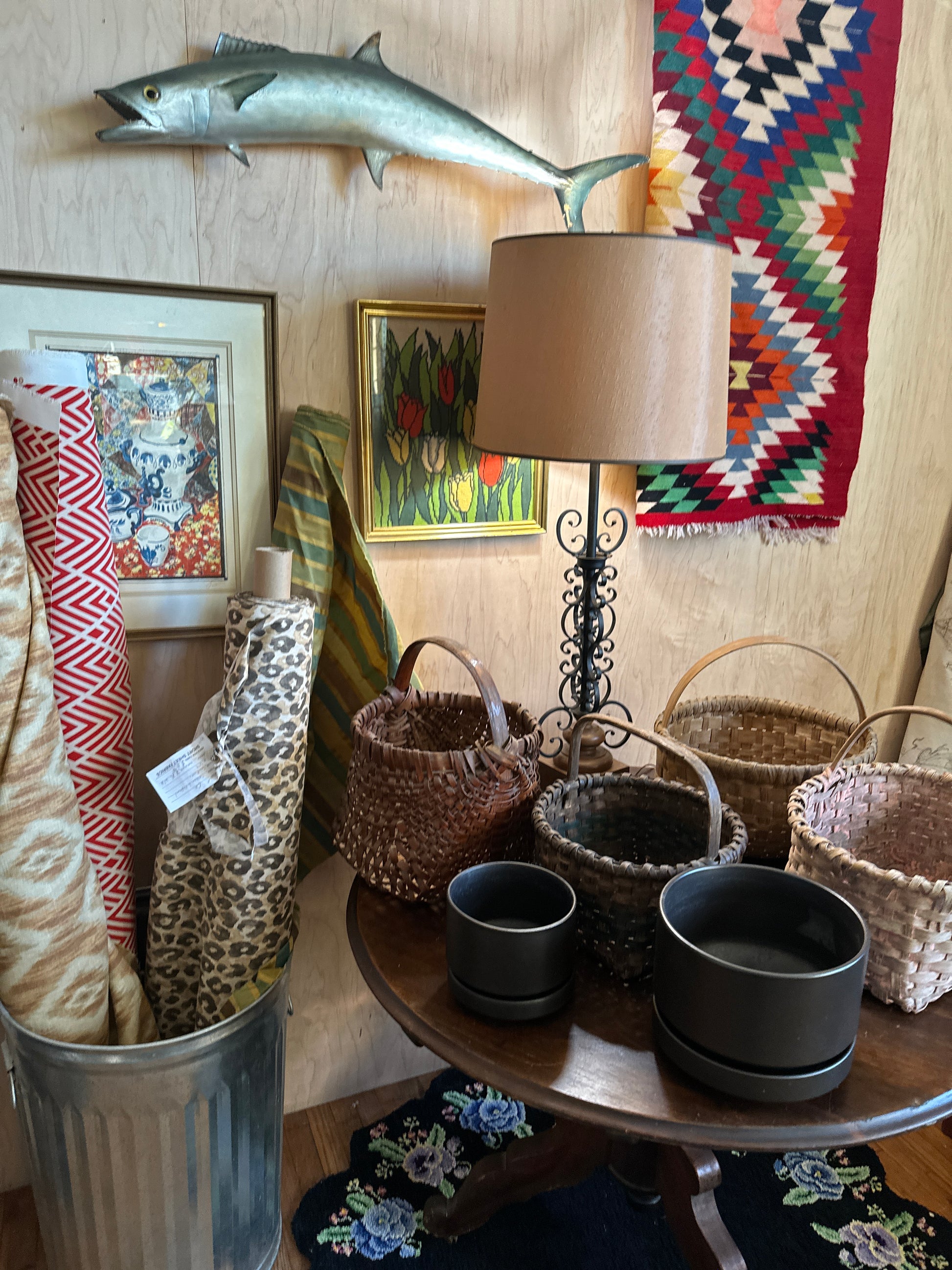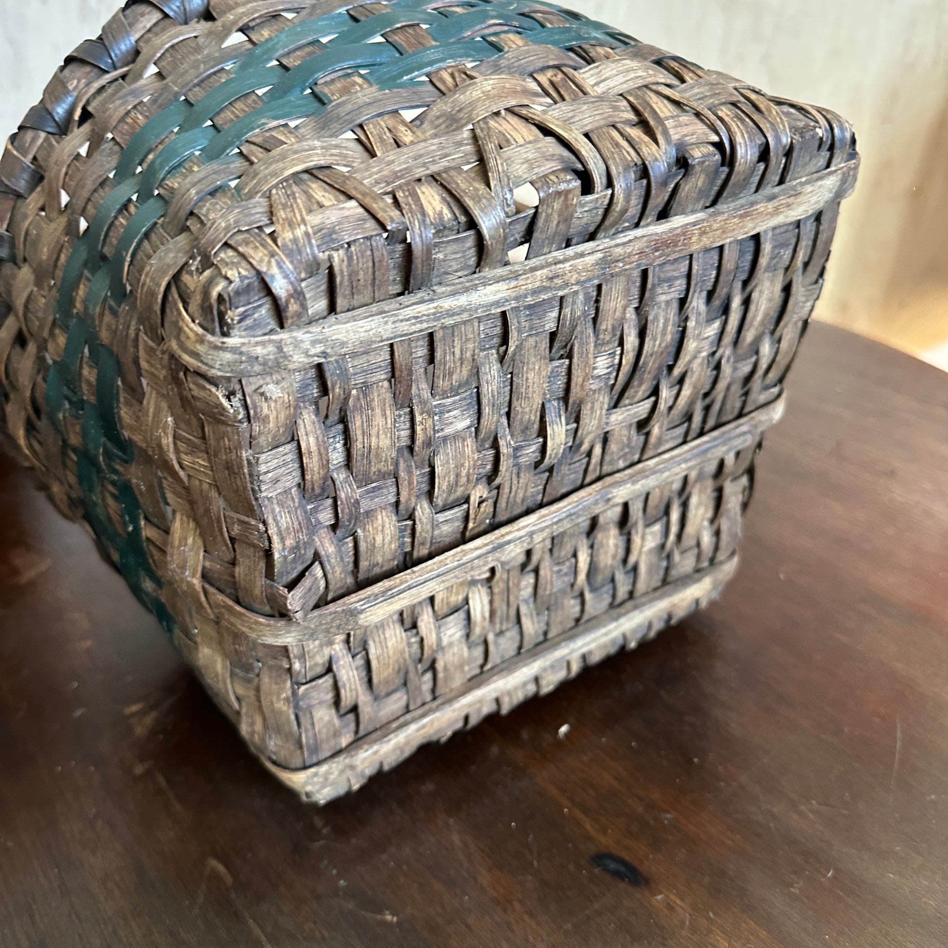 Hand woven antique splint oak gathering basket. Bentwood handle. Blue green painted band.