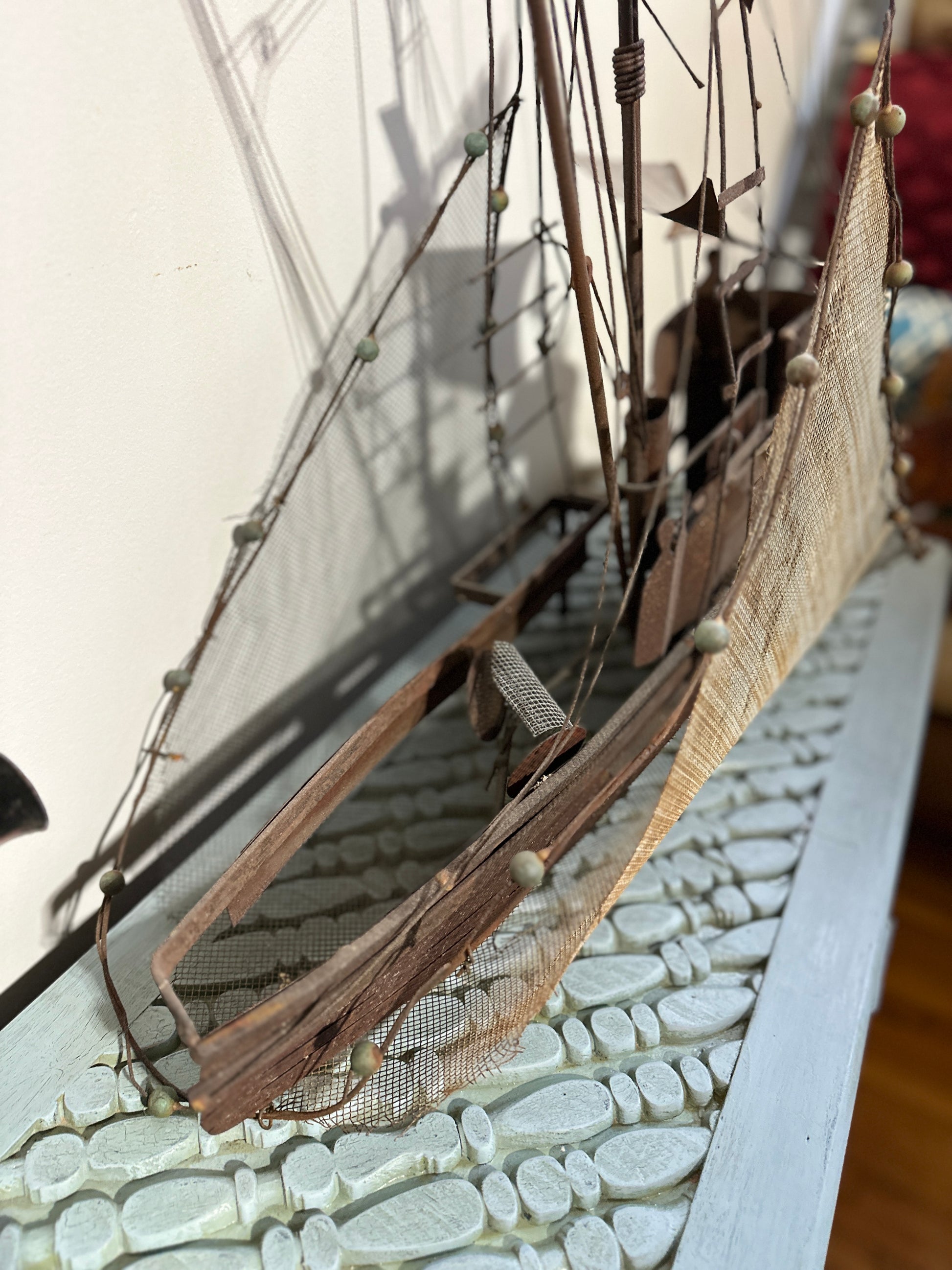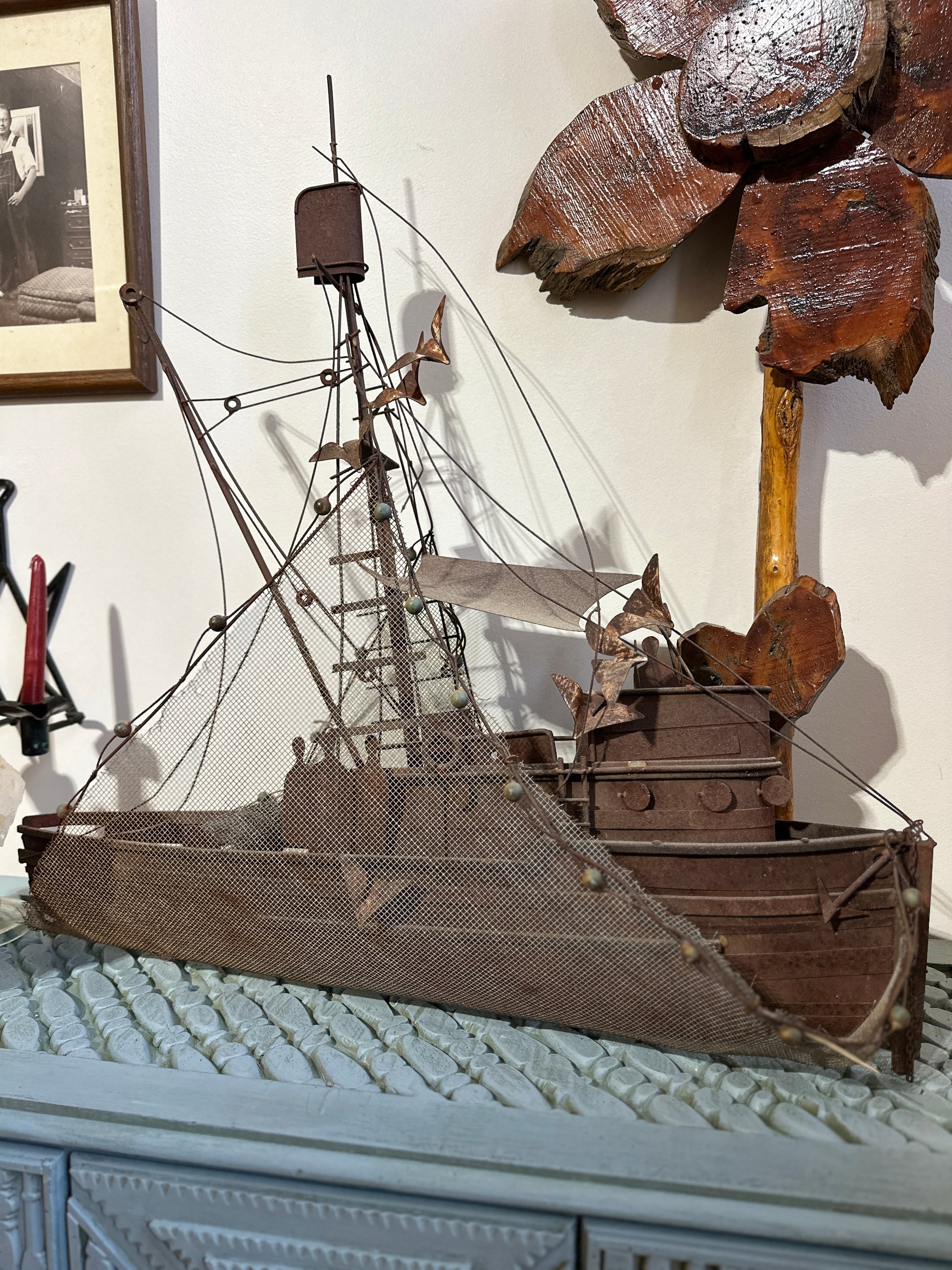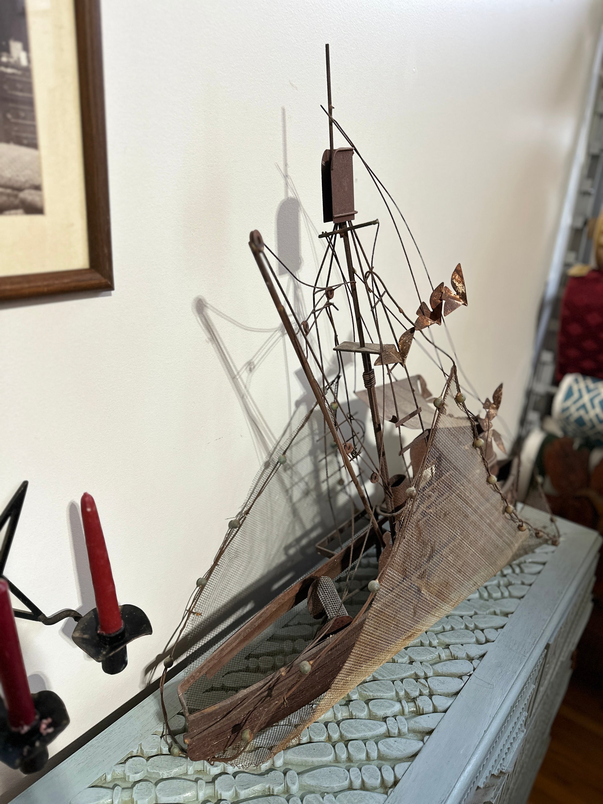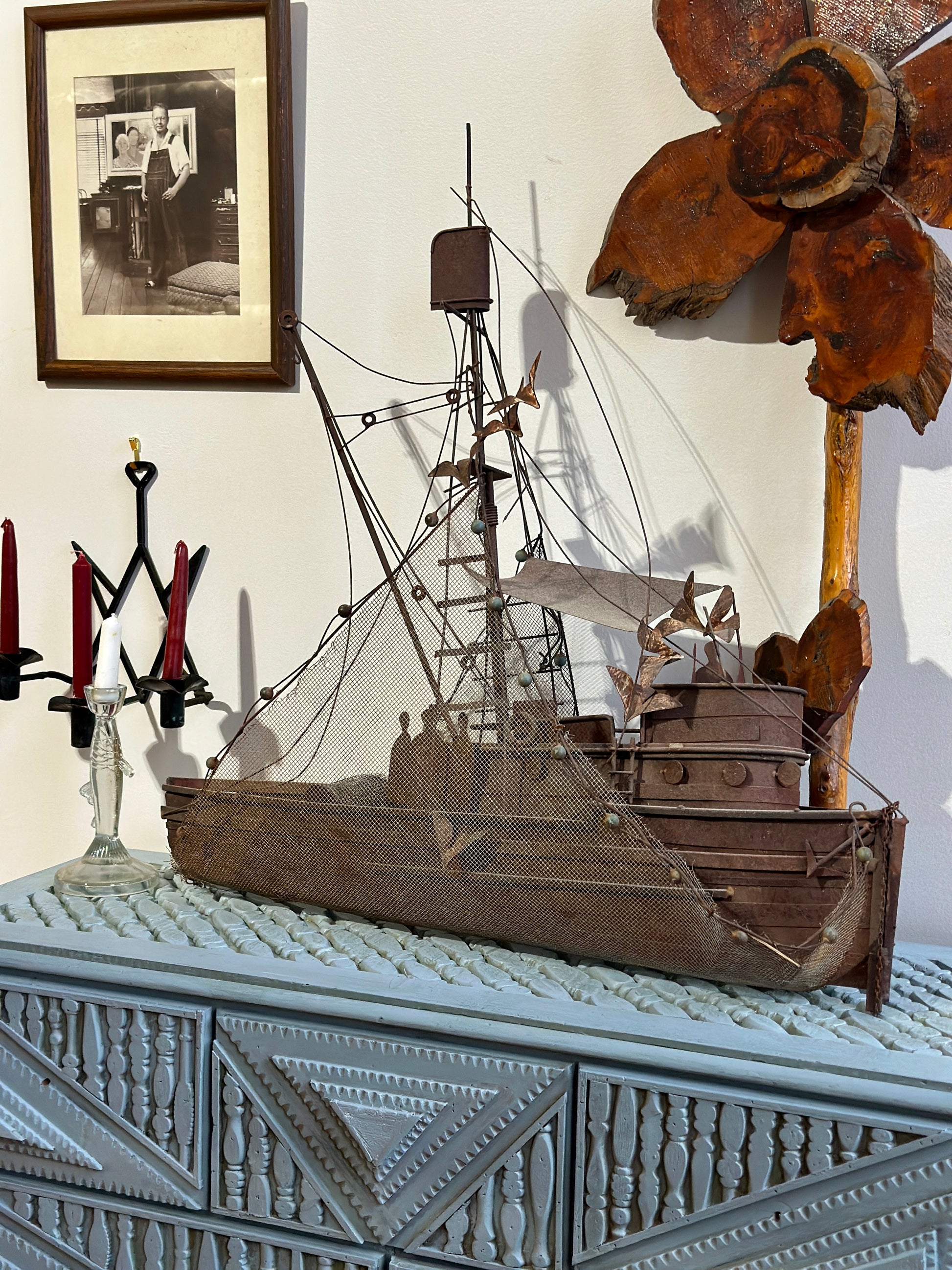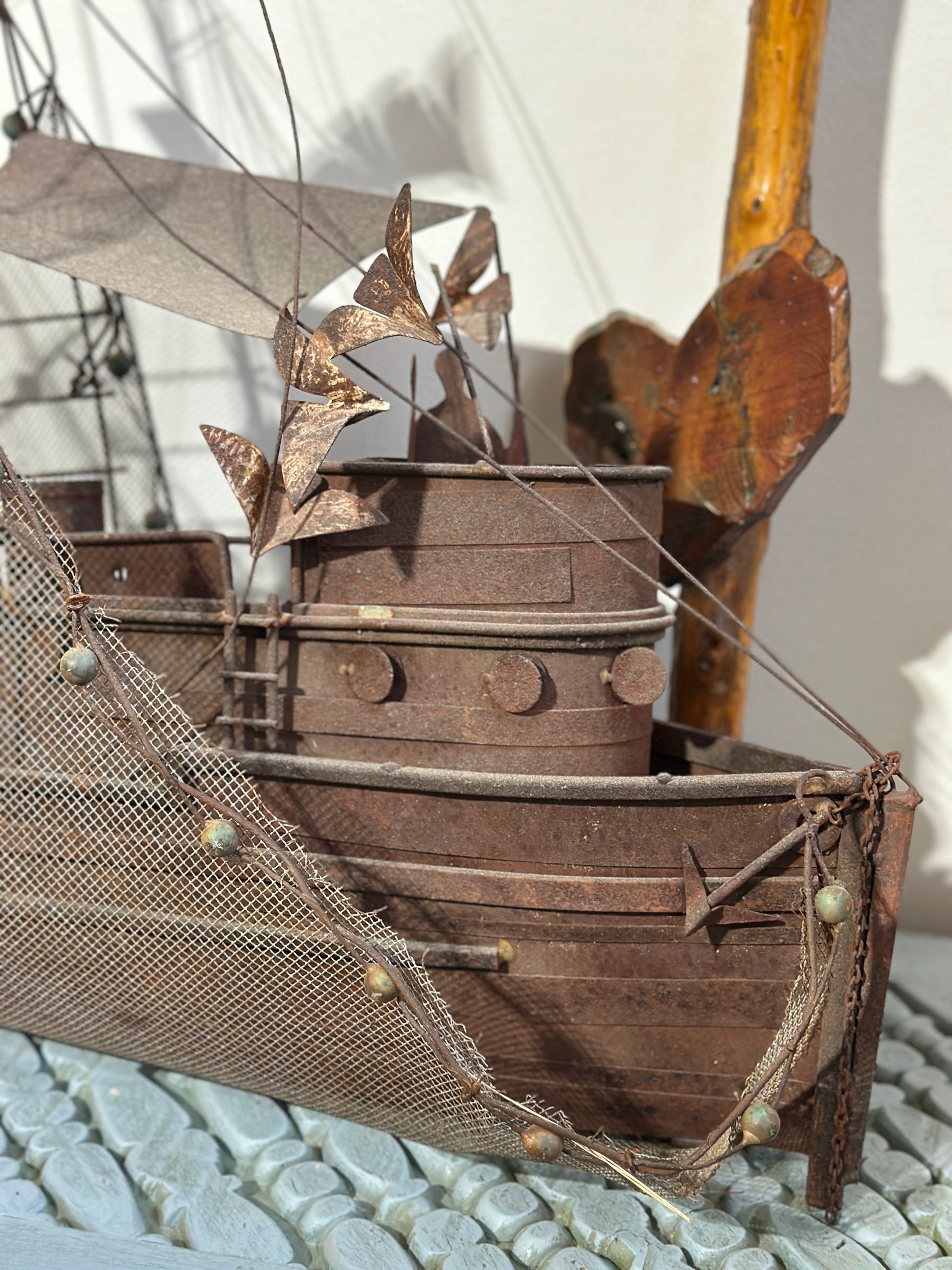 C Jere Maria boat sculpture wall hanging. This piece is sturdy but significantly rusted in a charming, survivor ish kind of way. Hanging bracket on back.