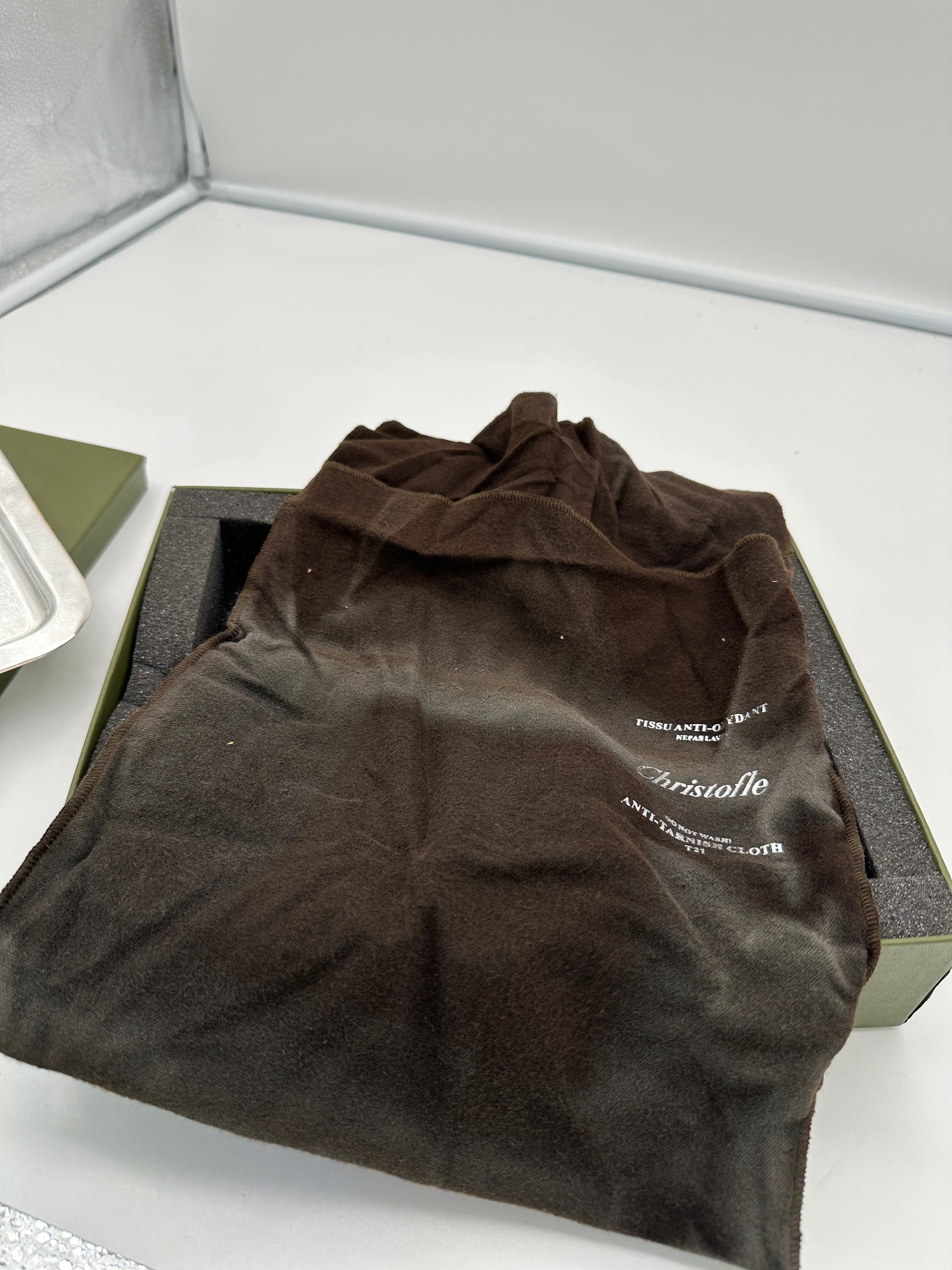 Small silver plated tray with floral Anemone detail on handle. Comes with box and felt bag. Approx 8x6"