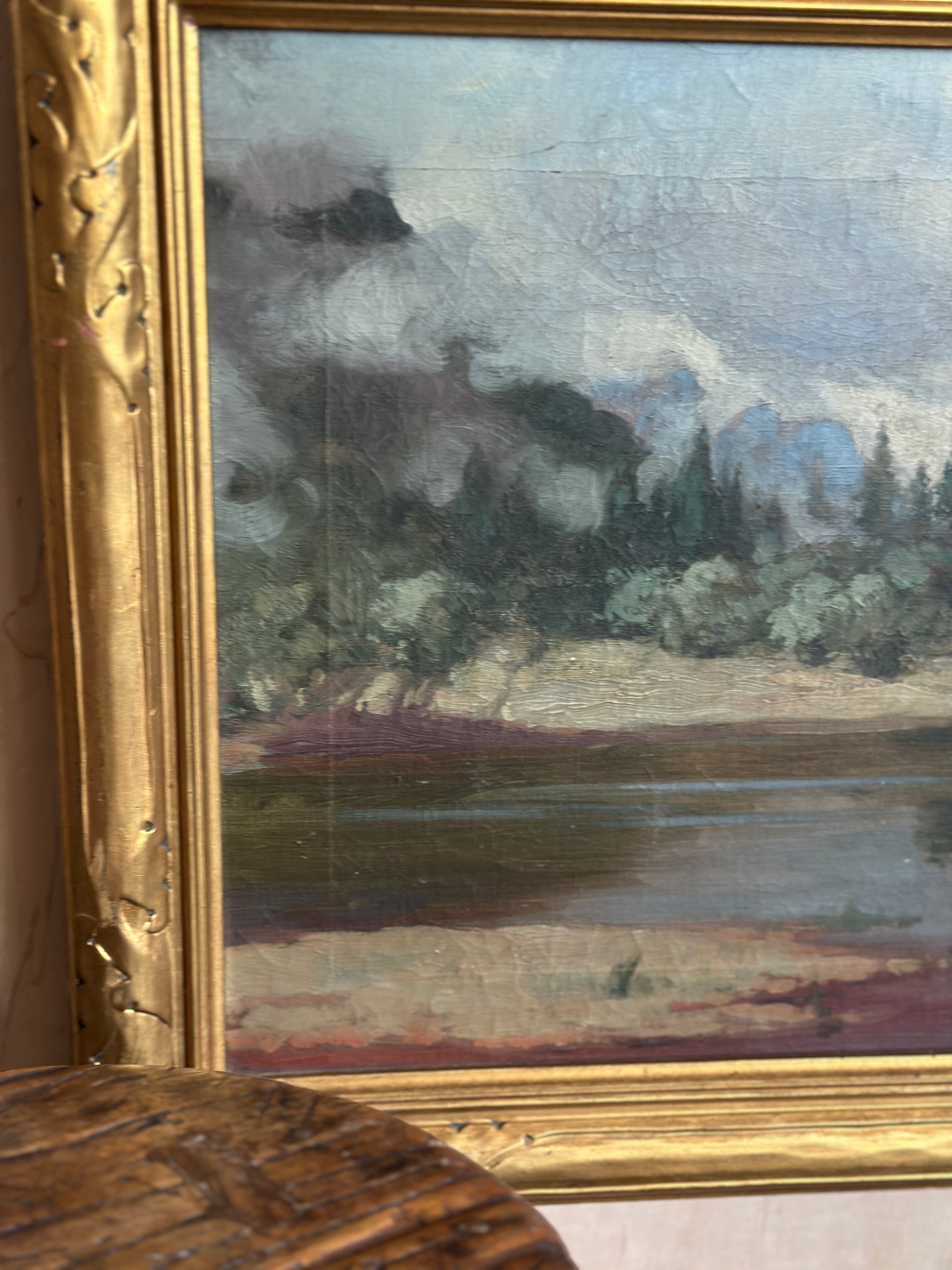 Oil on canvas landscape. Faint signature on bottom right corner. Beautiful gilt frame.