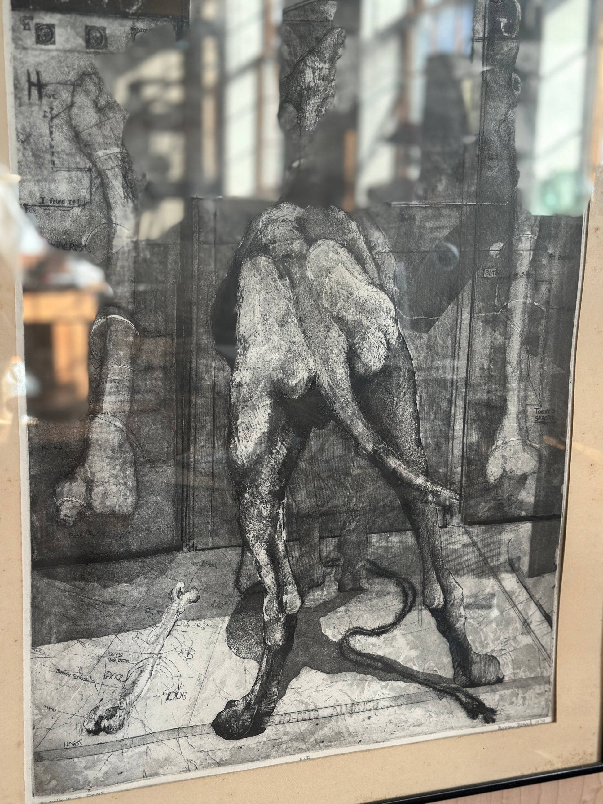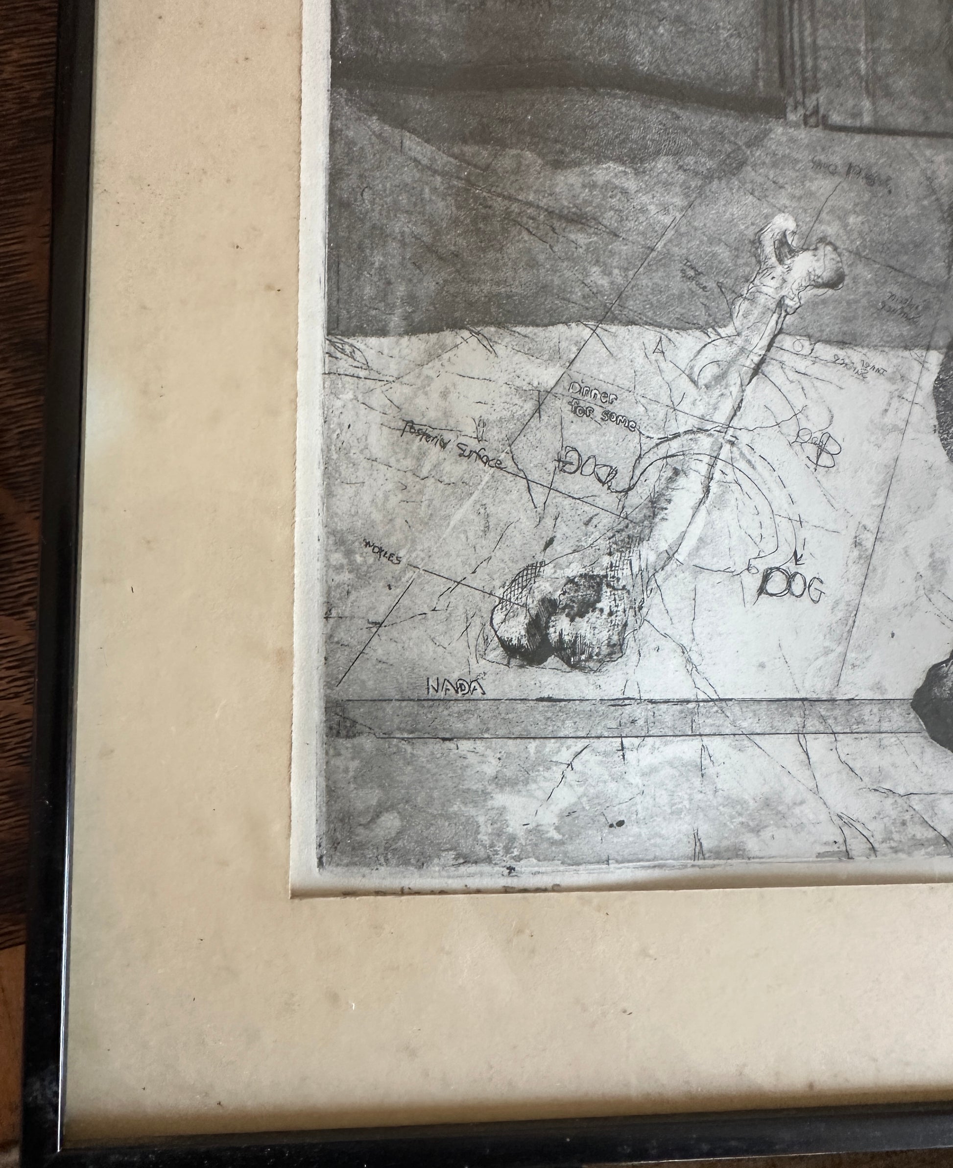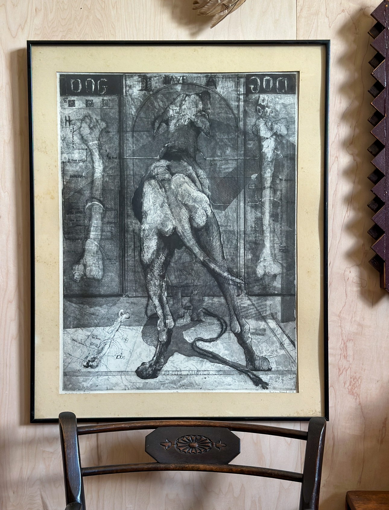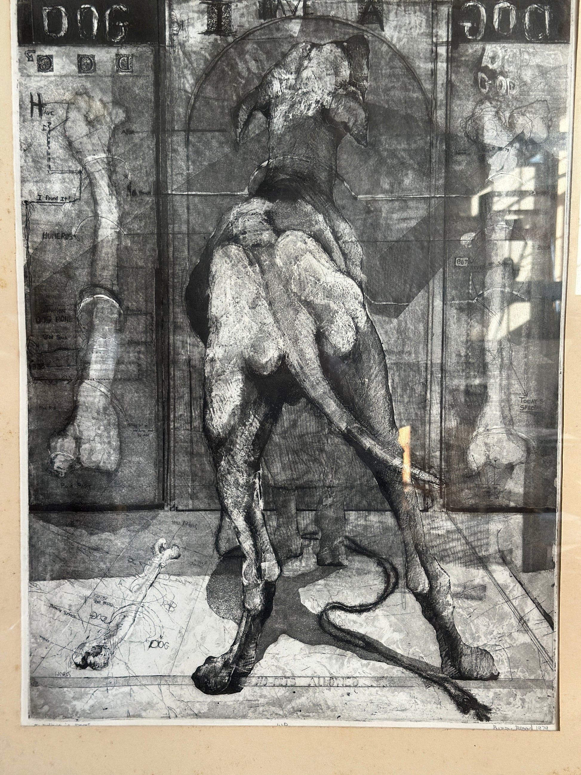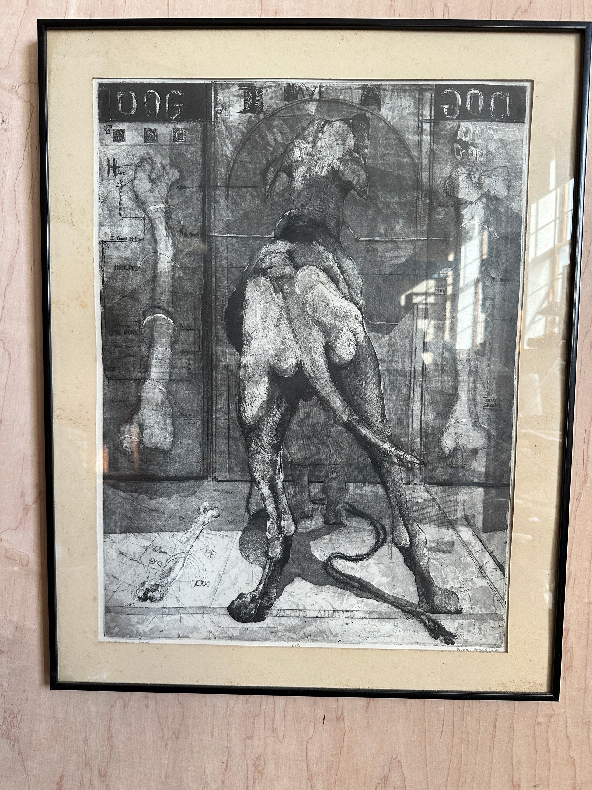 Etching on paper titled I Believe in Dogs. Glass & metal framed, approx 22x24". Signed "Buzzy" Broad 1979, artist is Deborahmae Broad. Some marks/aging to mat as shown.