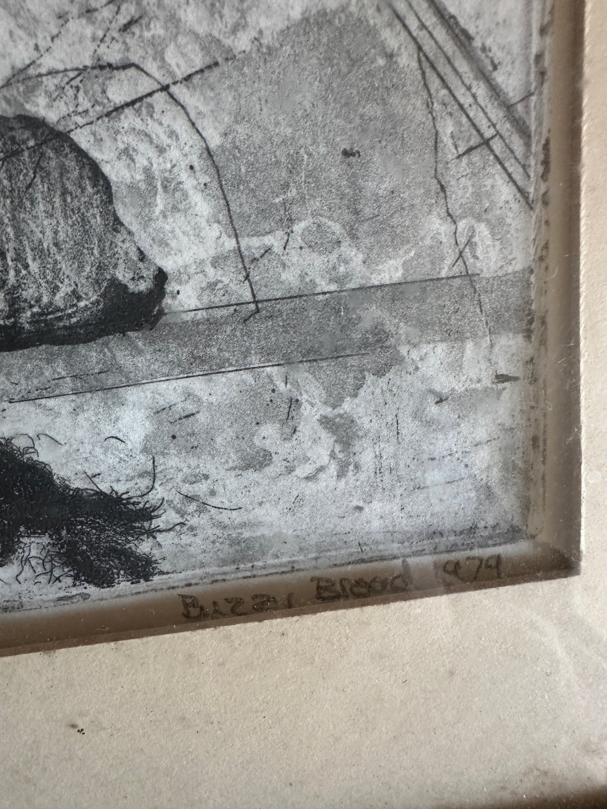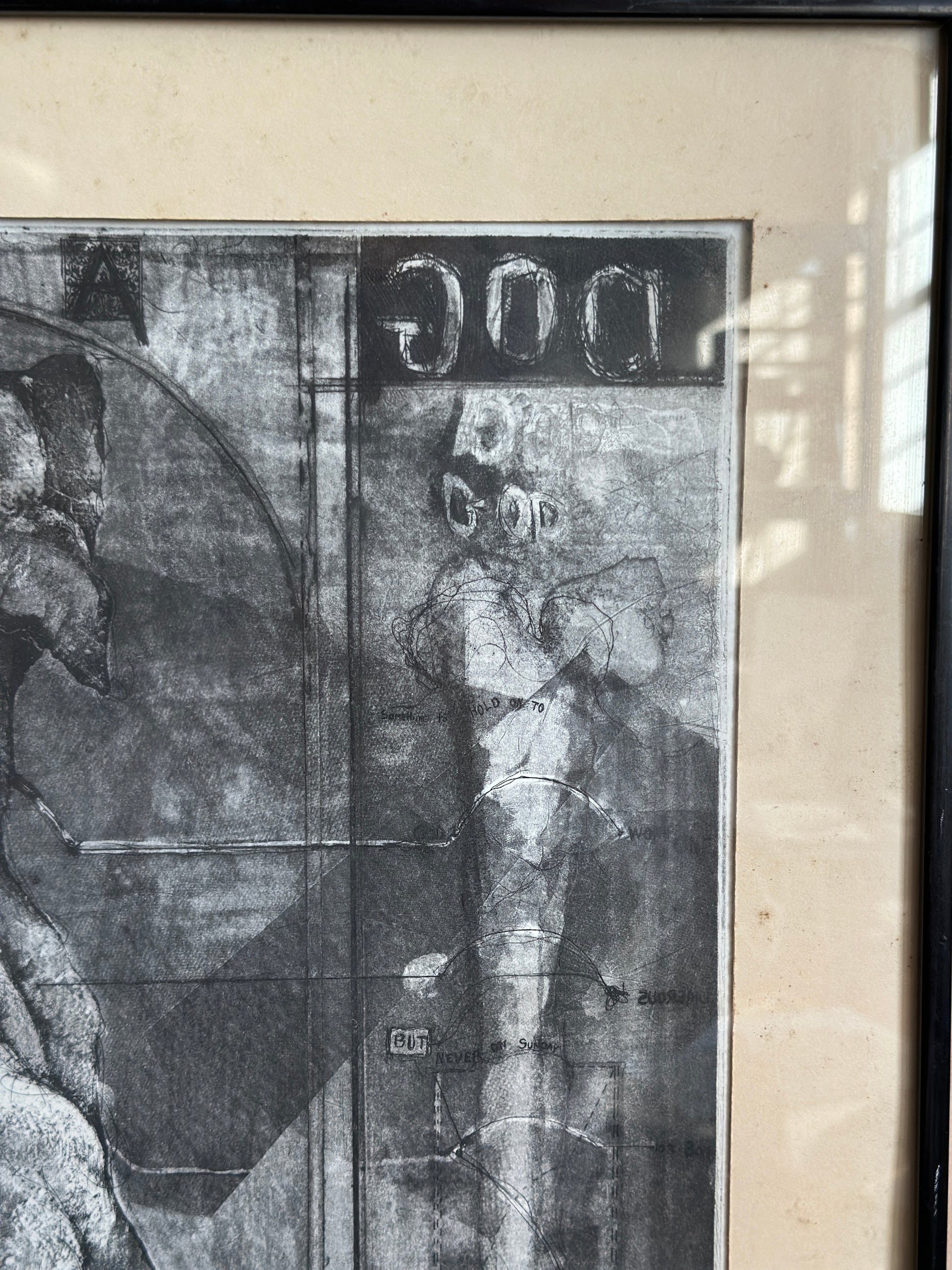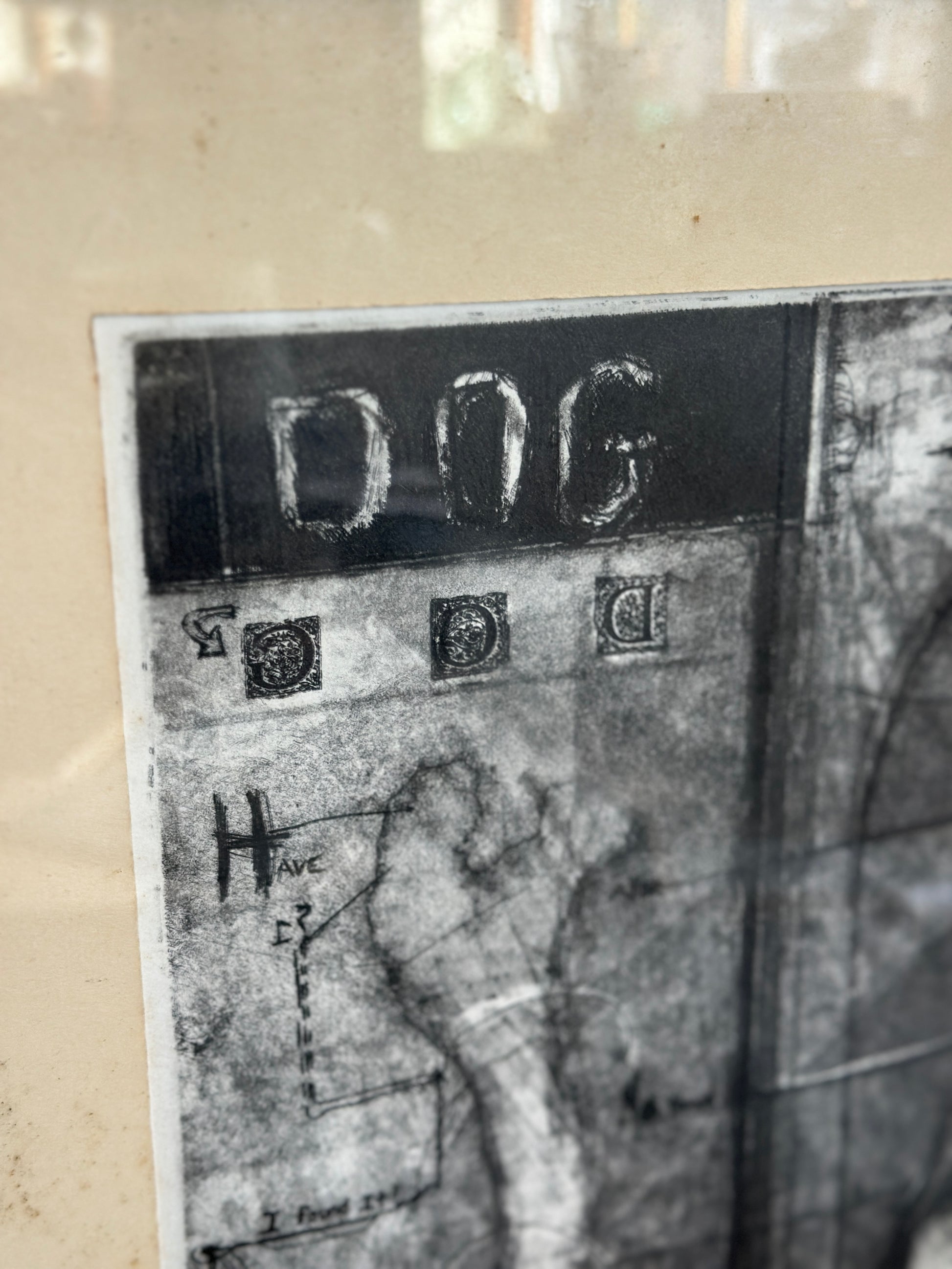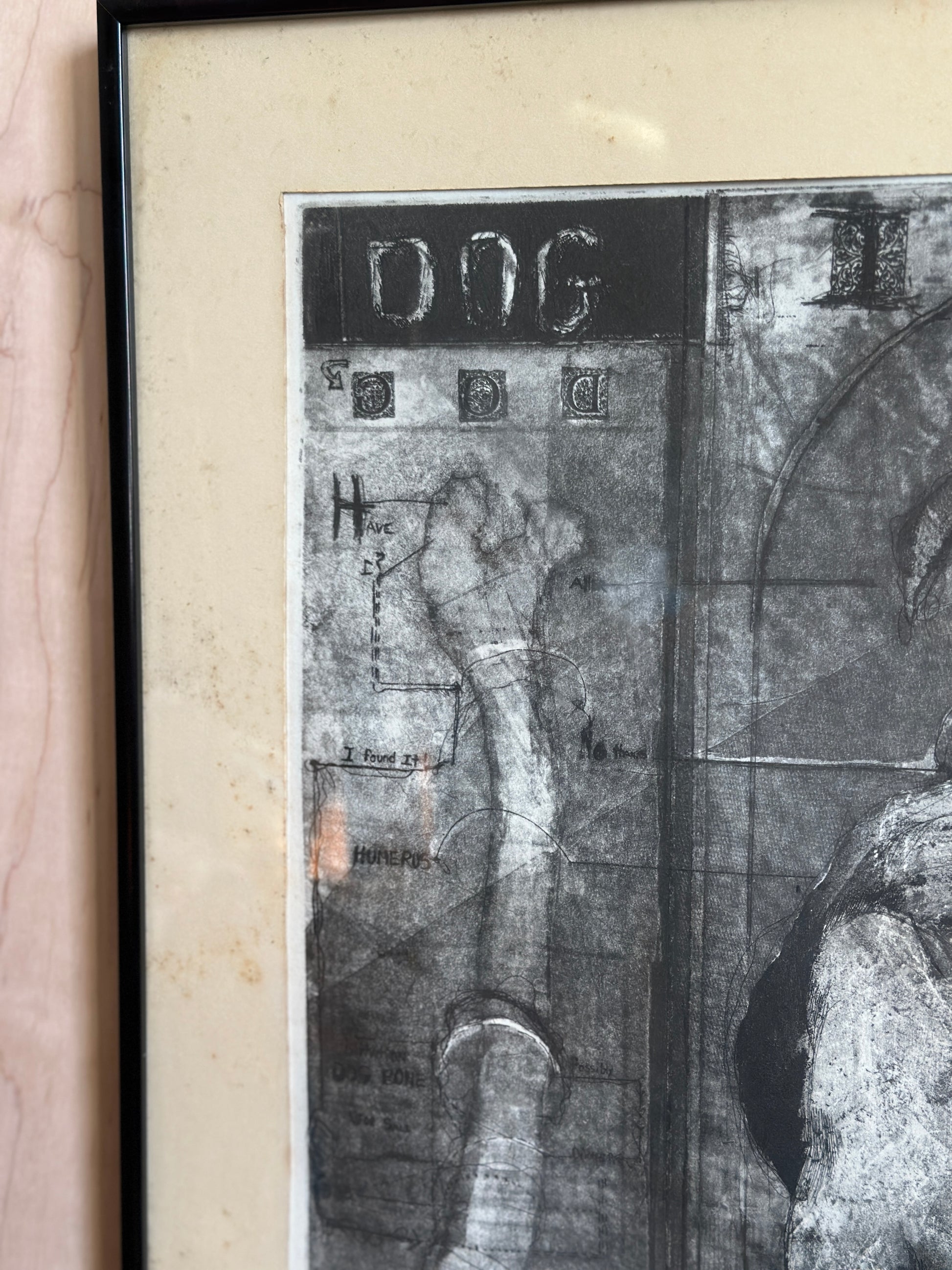 Etching on paper titled I Believe in Dogs. Glass & metal framed, approx 22x24". Signed "Buzzy" Broad 1979, artist is Deborahmae Broad. Some marks/aging to mat as shown.