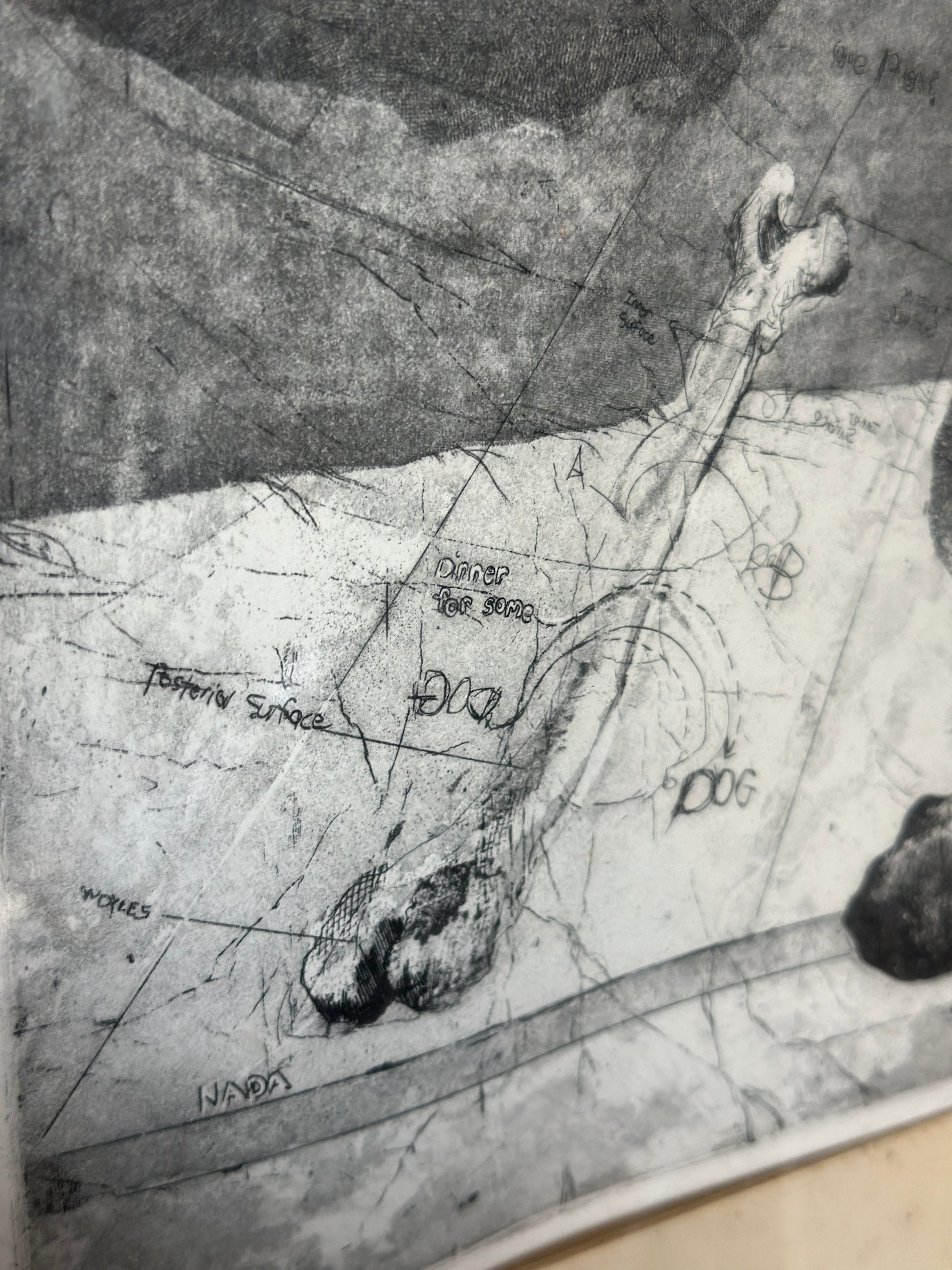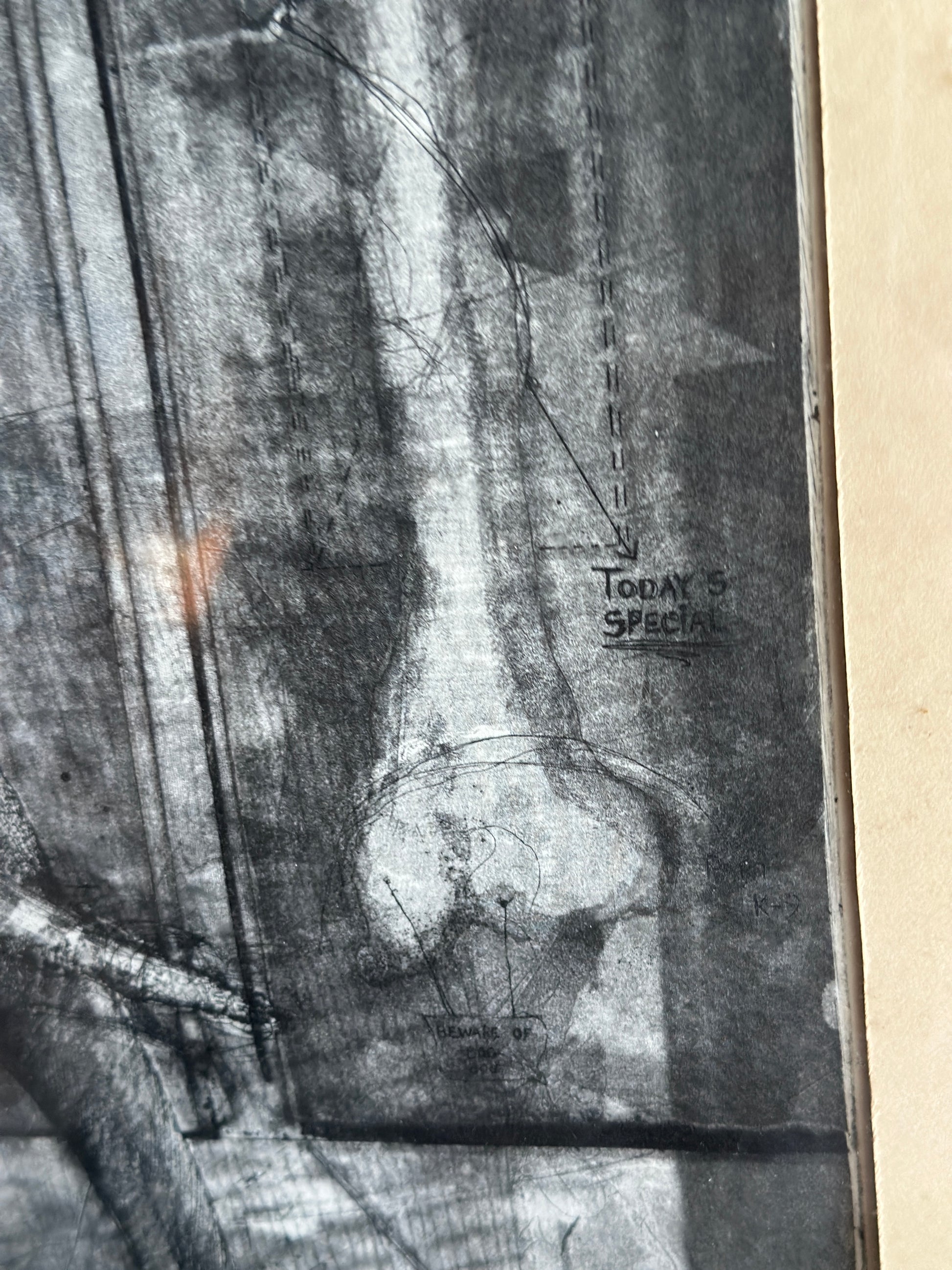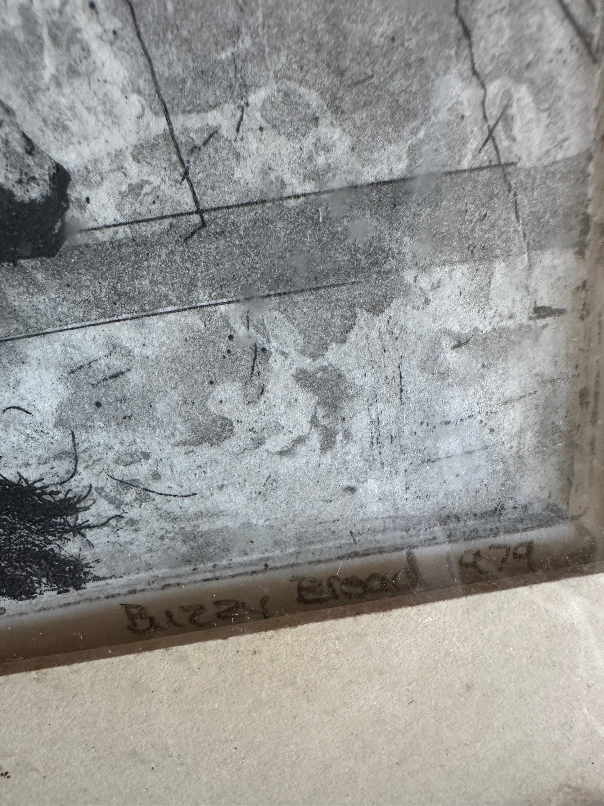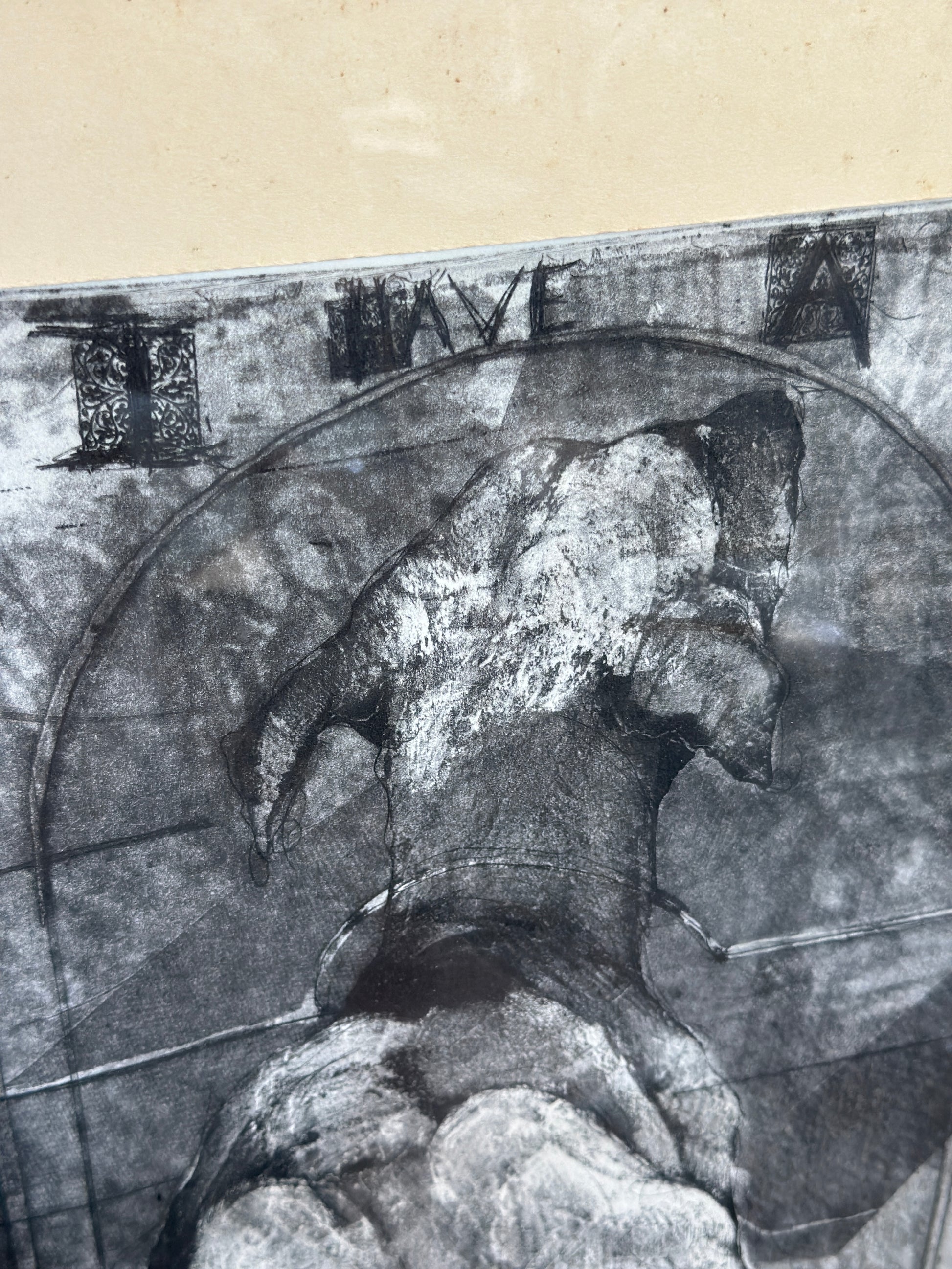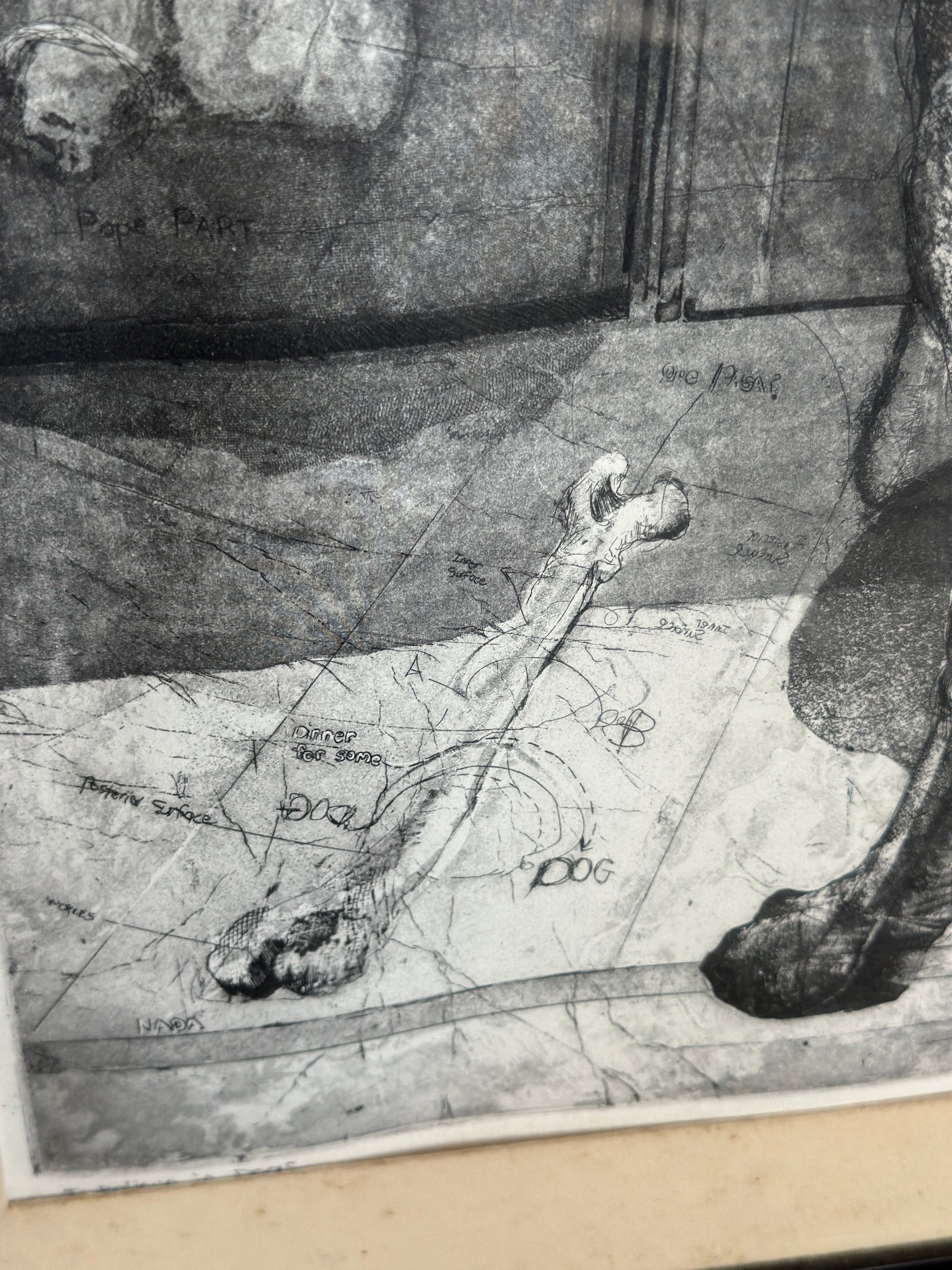 Etching on paper titled I Believe in Dogs. Glass & metal framed, approx 22x24". Signed "Buzzy" Broad 1979, artist is Deborahmae Broad. Some marks/aging to mat as shown.