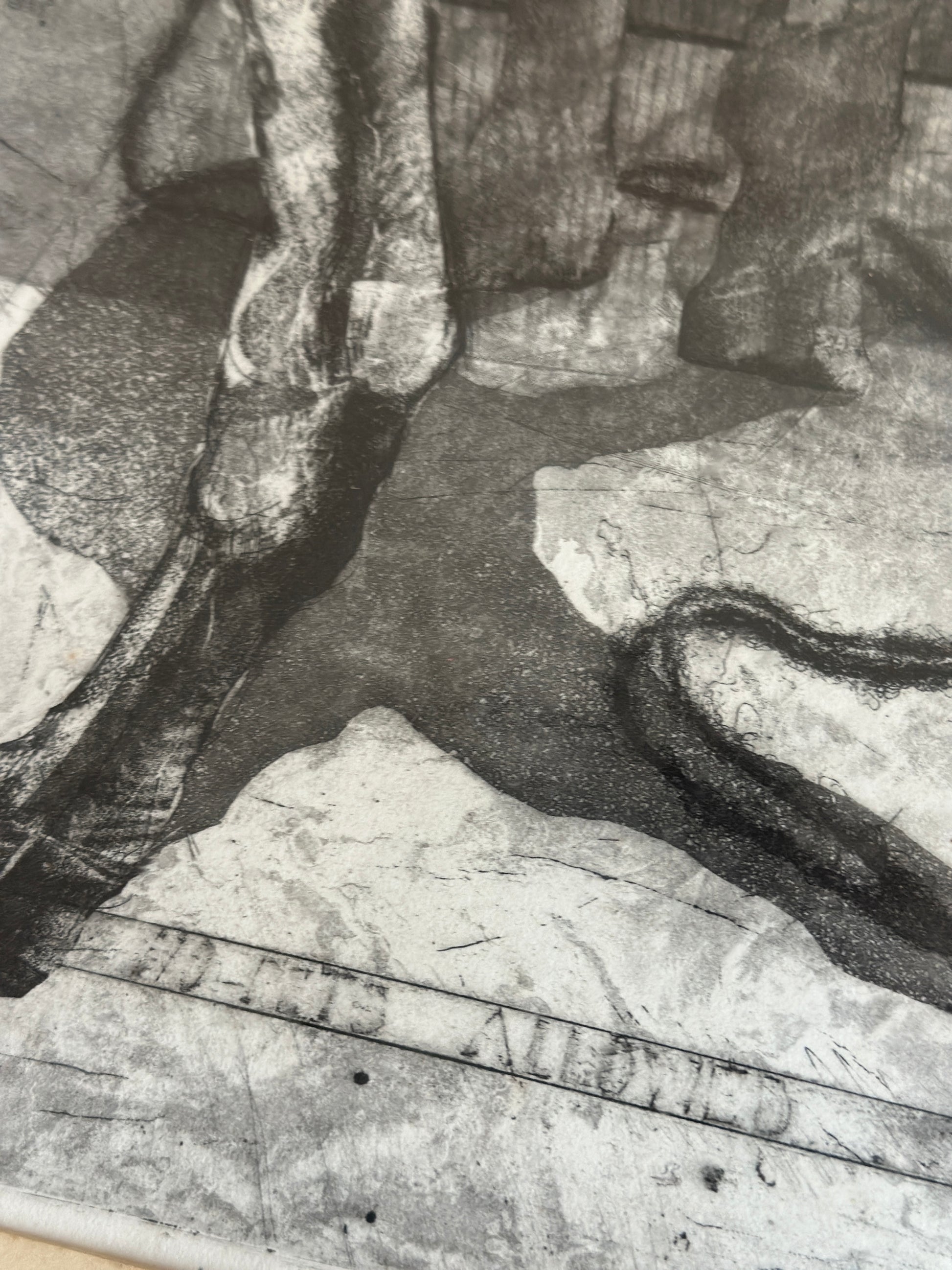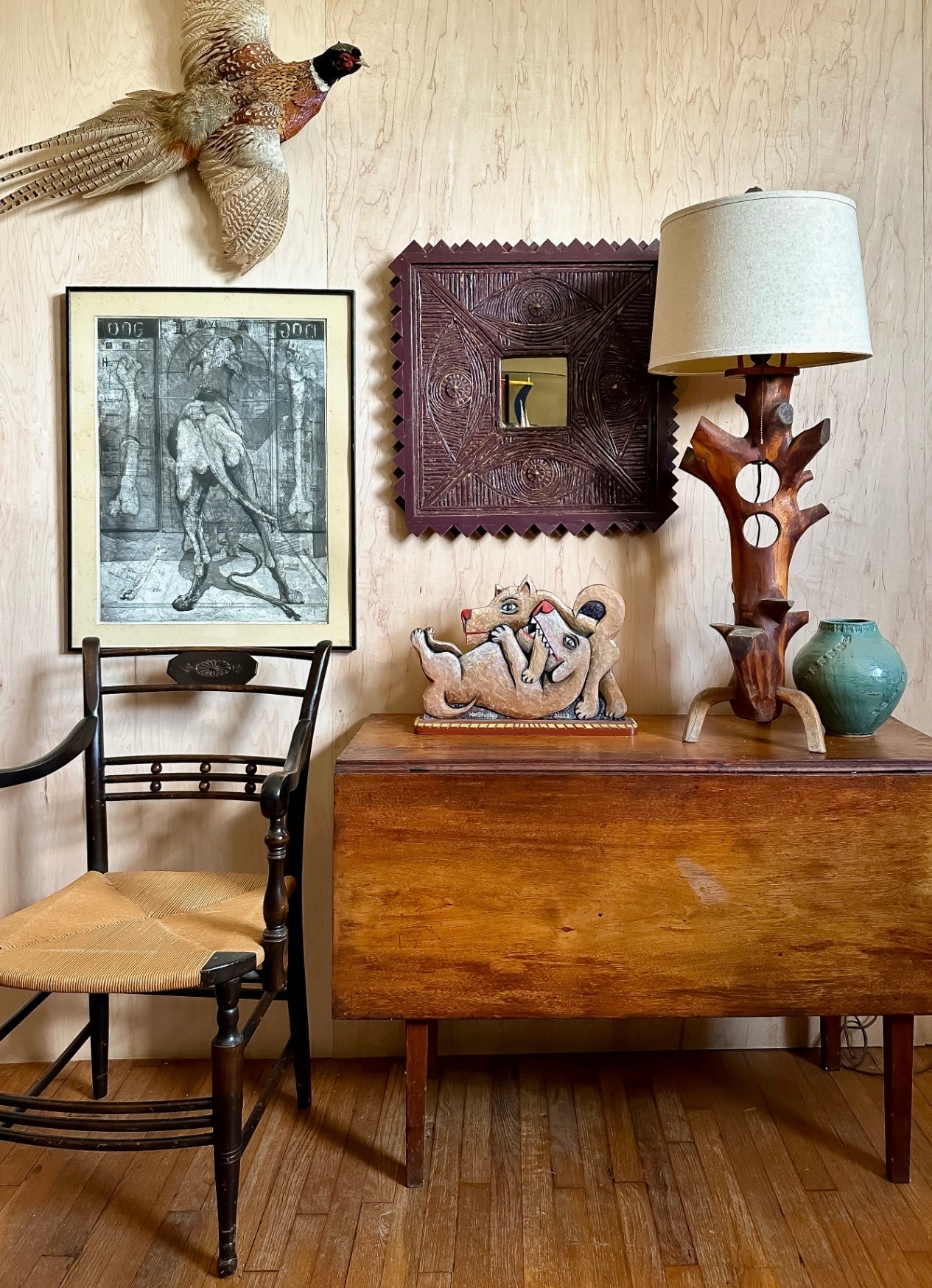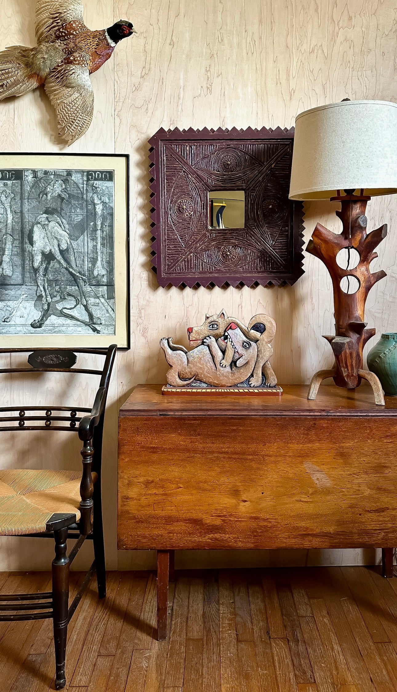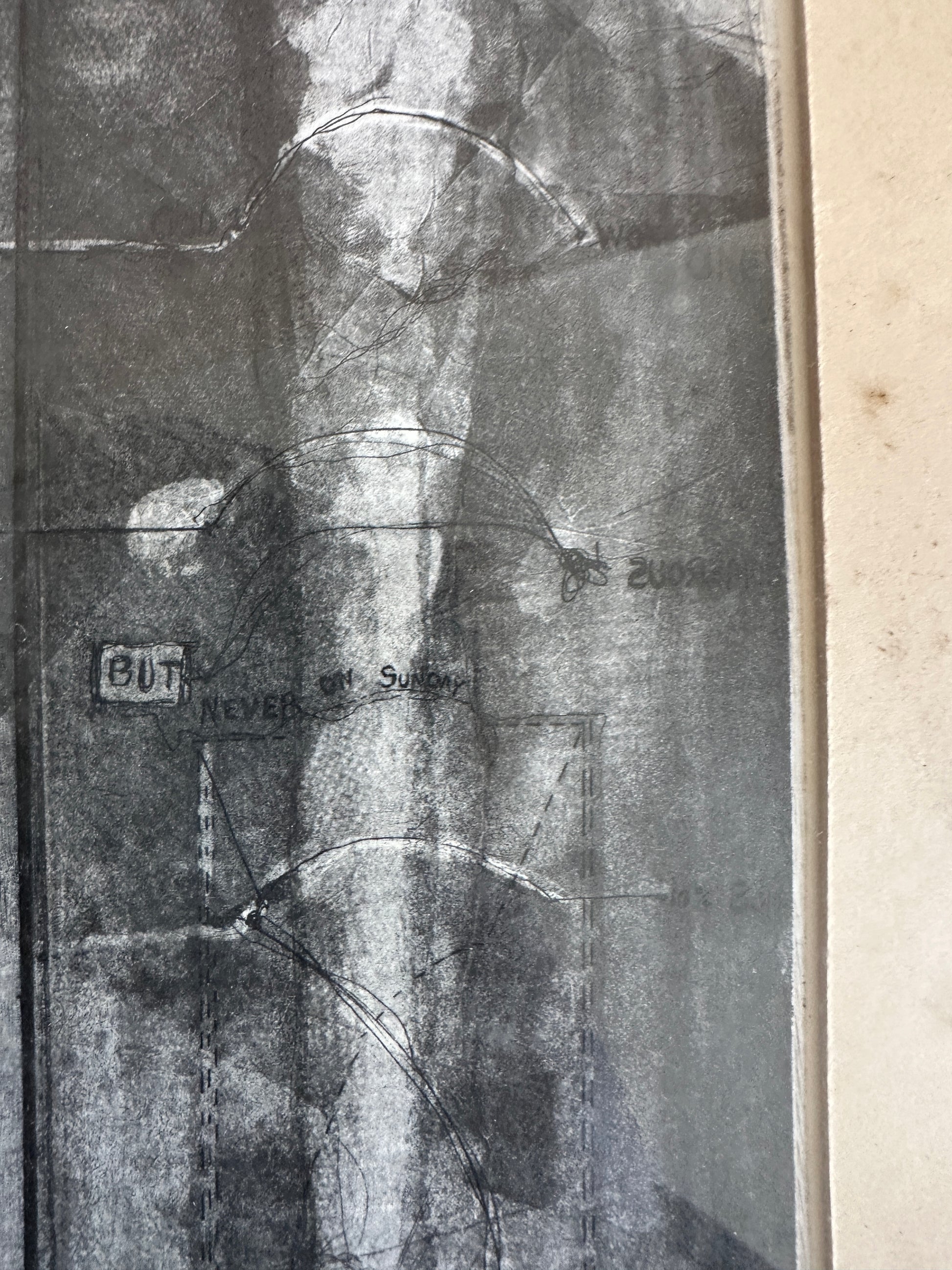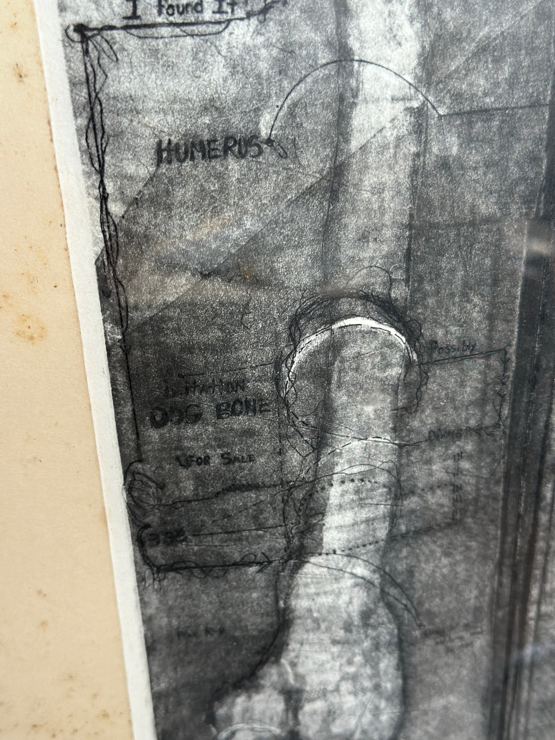 Etching on paper titled I Believe in Dogs. Glass & metal framed, approx 22x24". Signed "Buzzy" Broad 1979, artist is Deborahmae Broad. Some marks/aging to mat as shown.