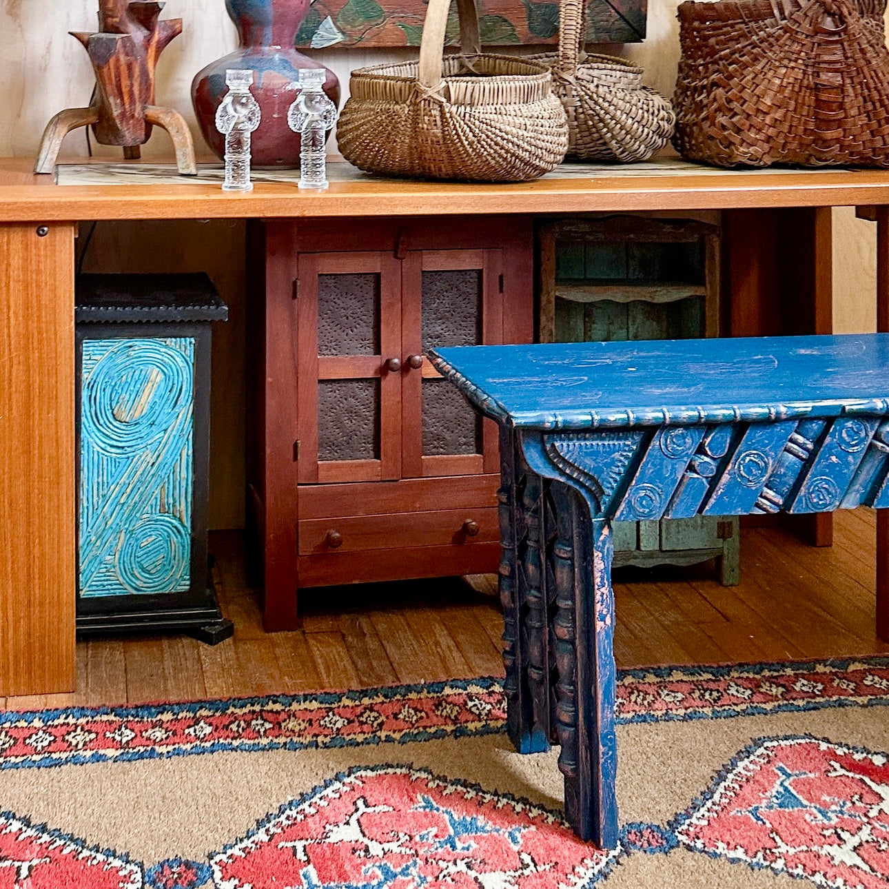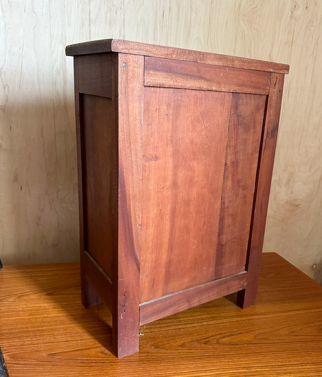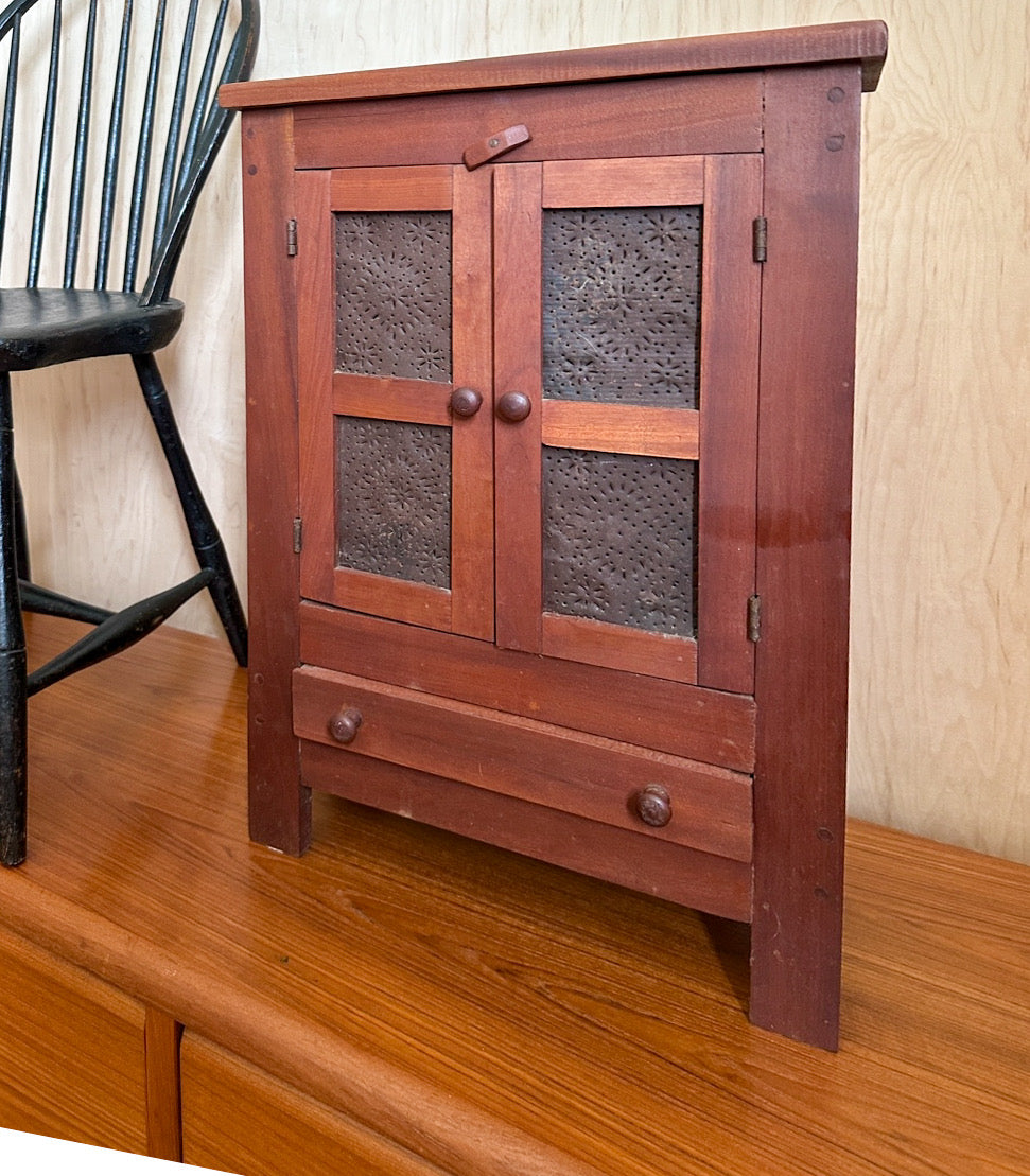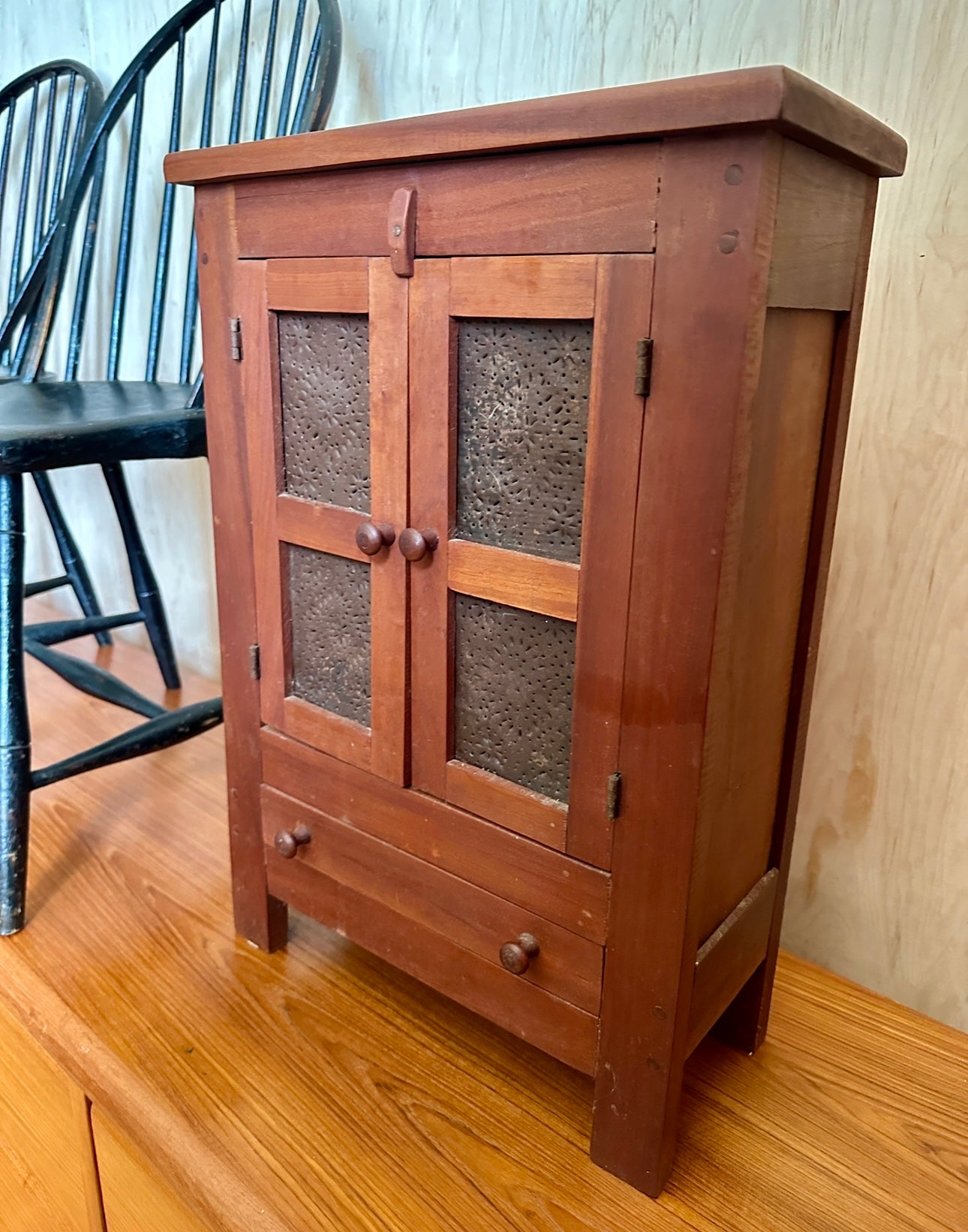 Excellent small pie safe cabinet. Likely a salesman sample or handmade toy. Punched tin doors and one working drawer. 2 interior shelves. Rustic but in very good condition. 24" h x 16.5"w