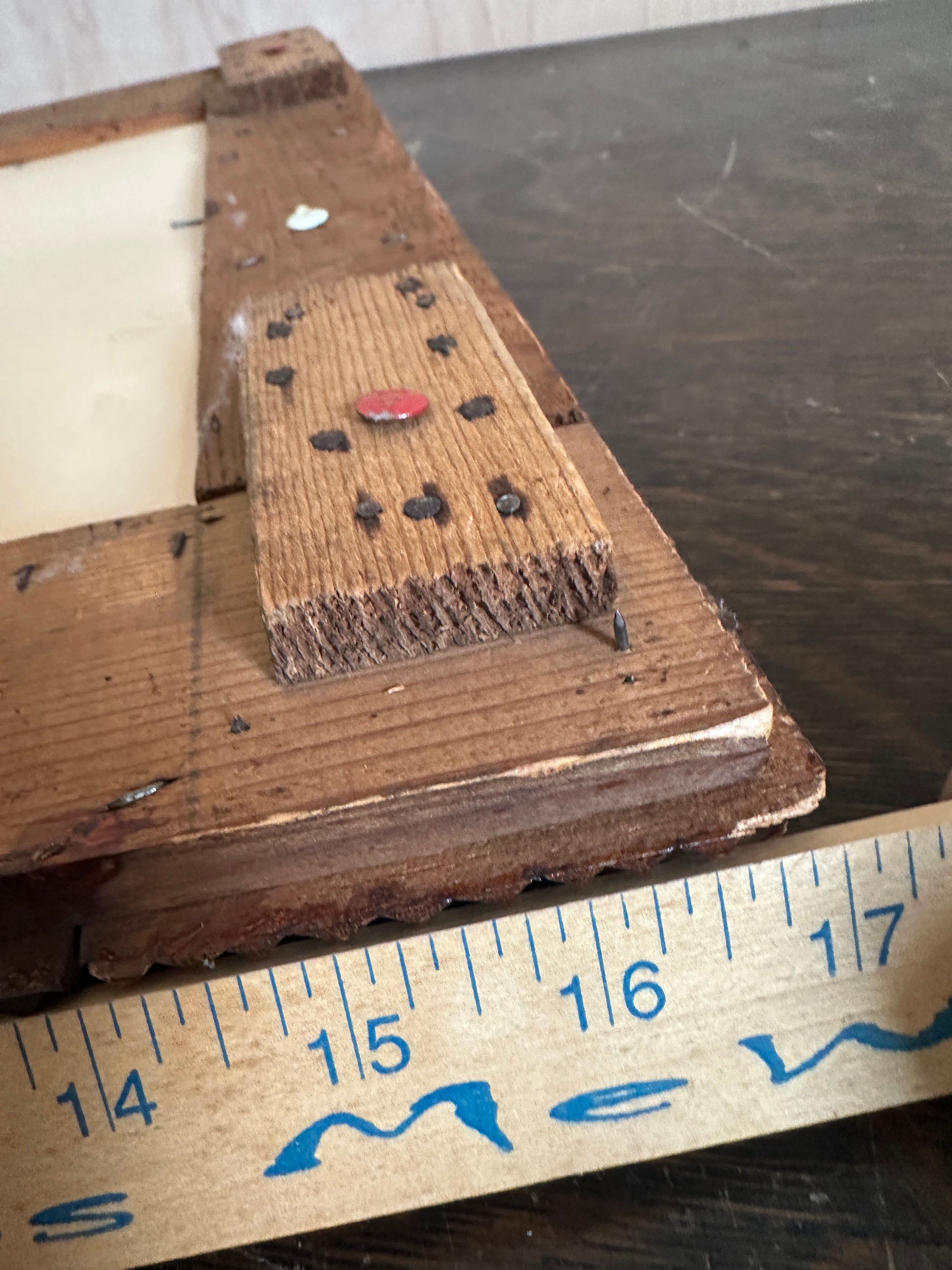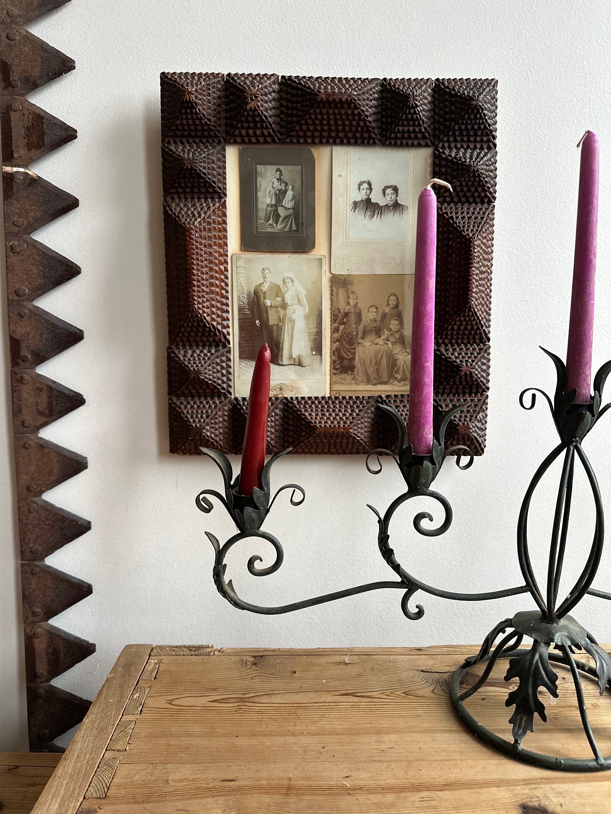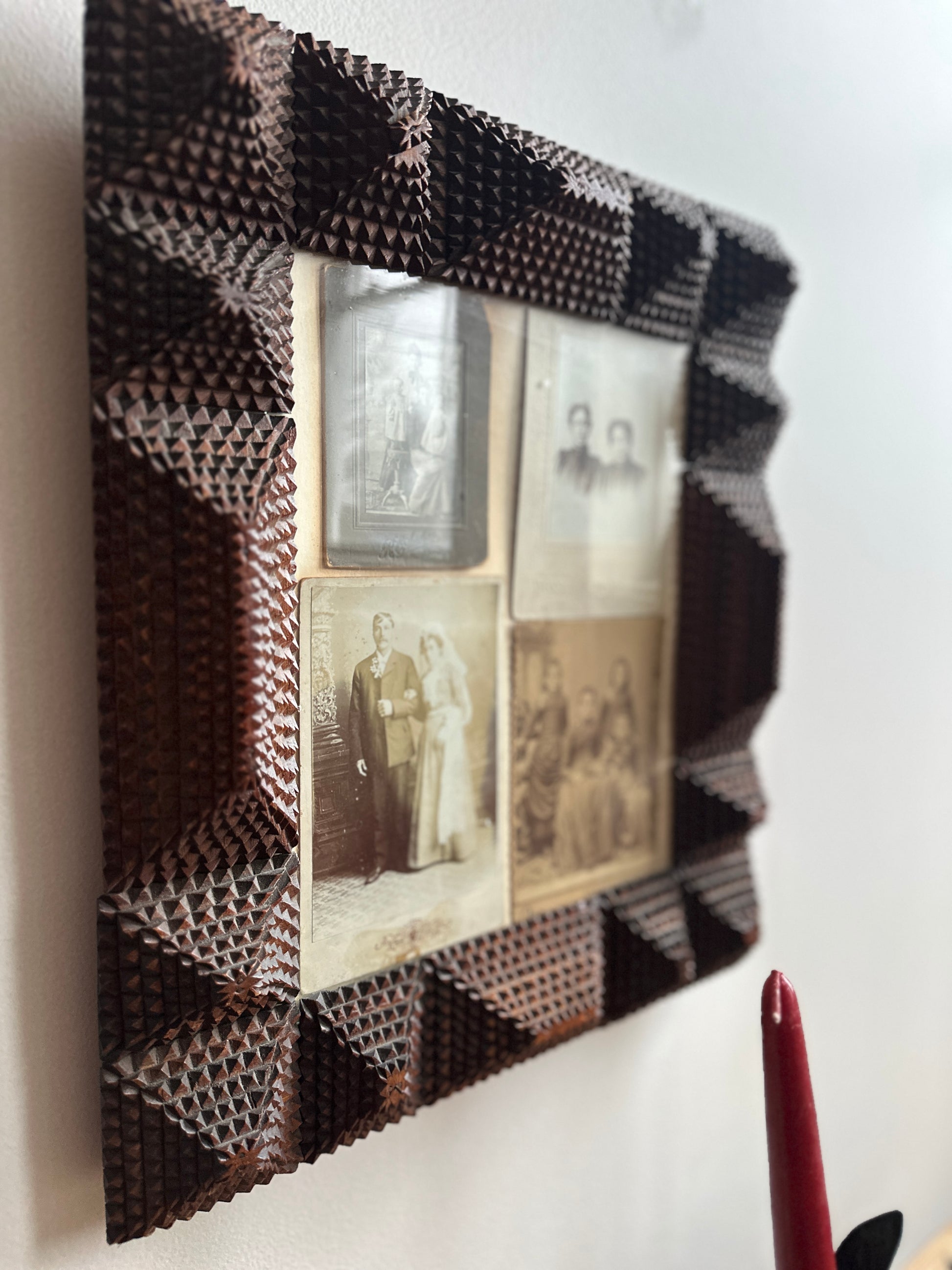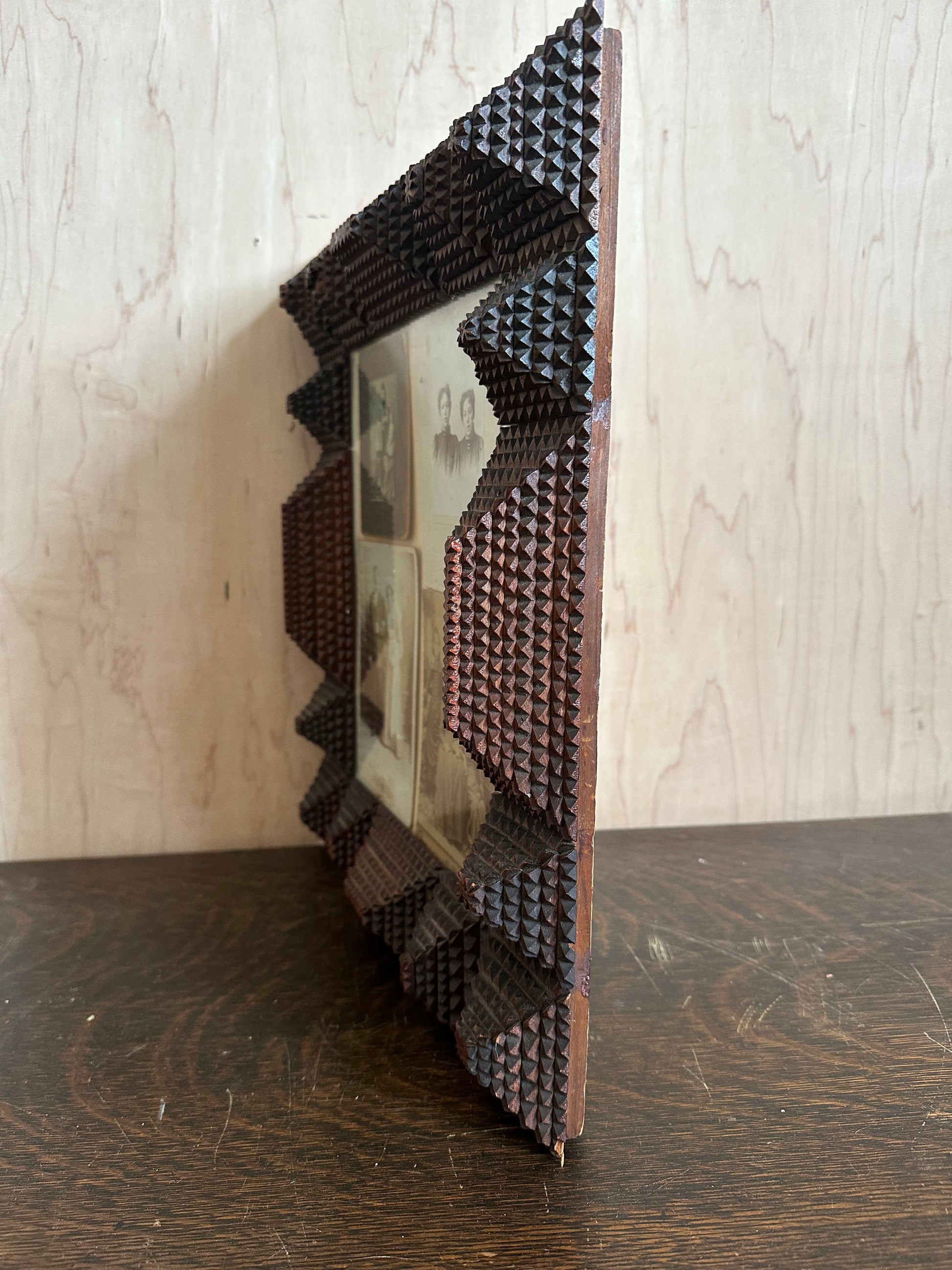 Wood Tramp style frame. Handmade. Please see pictures for condition- missing one layer on bottom left stack. Offered exactly as found with 4 antique photographs.