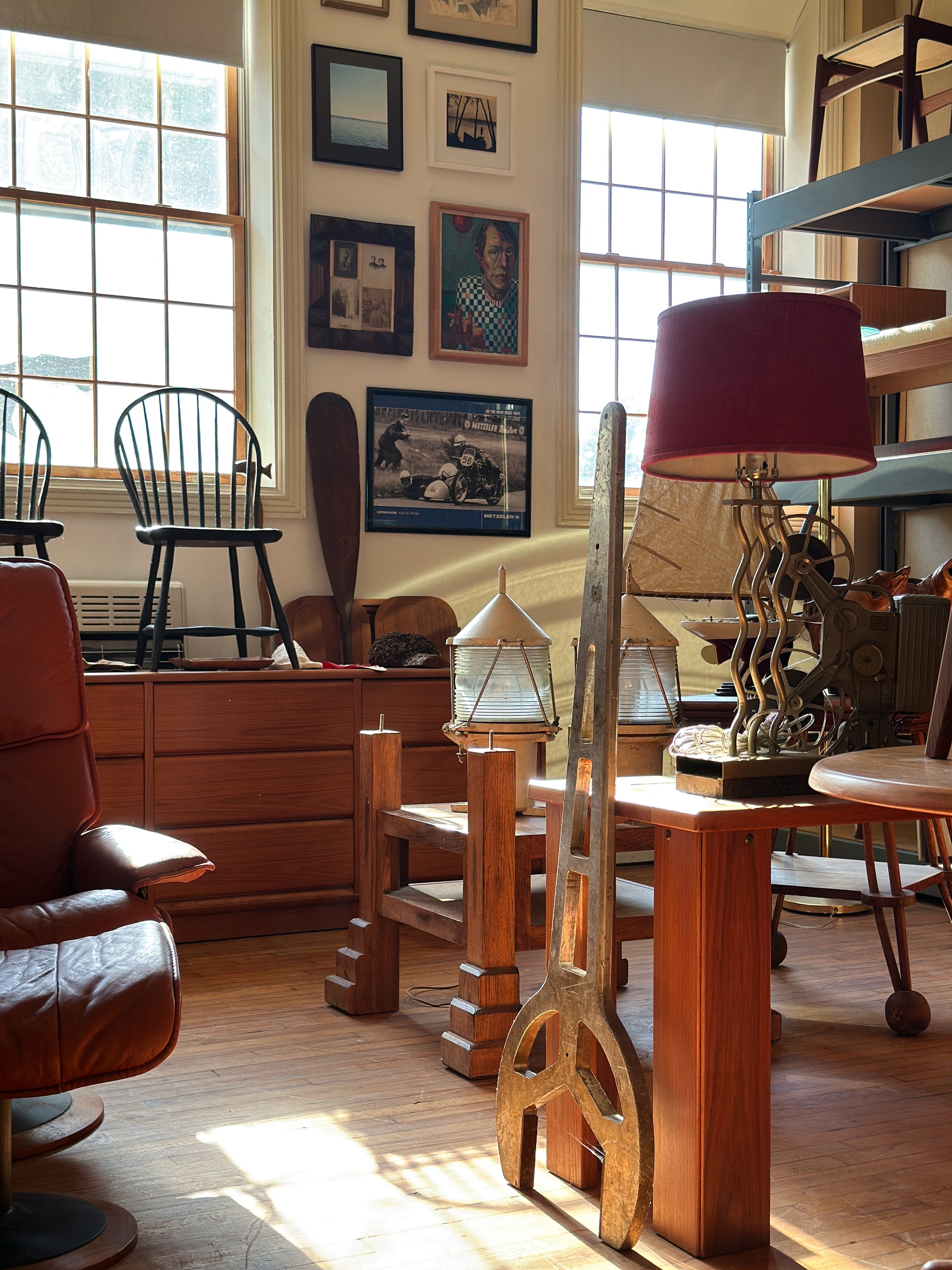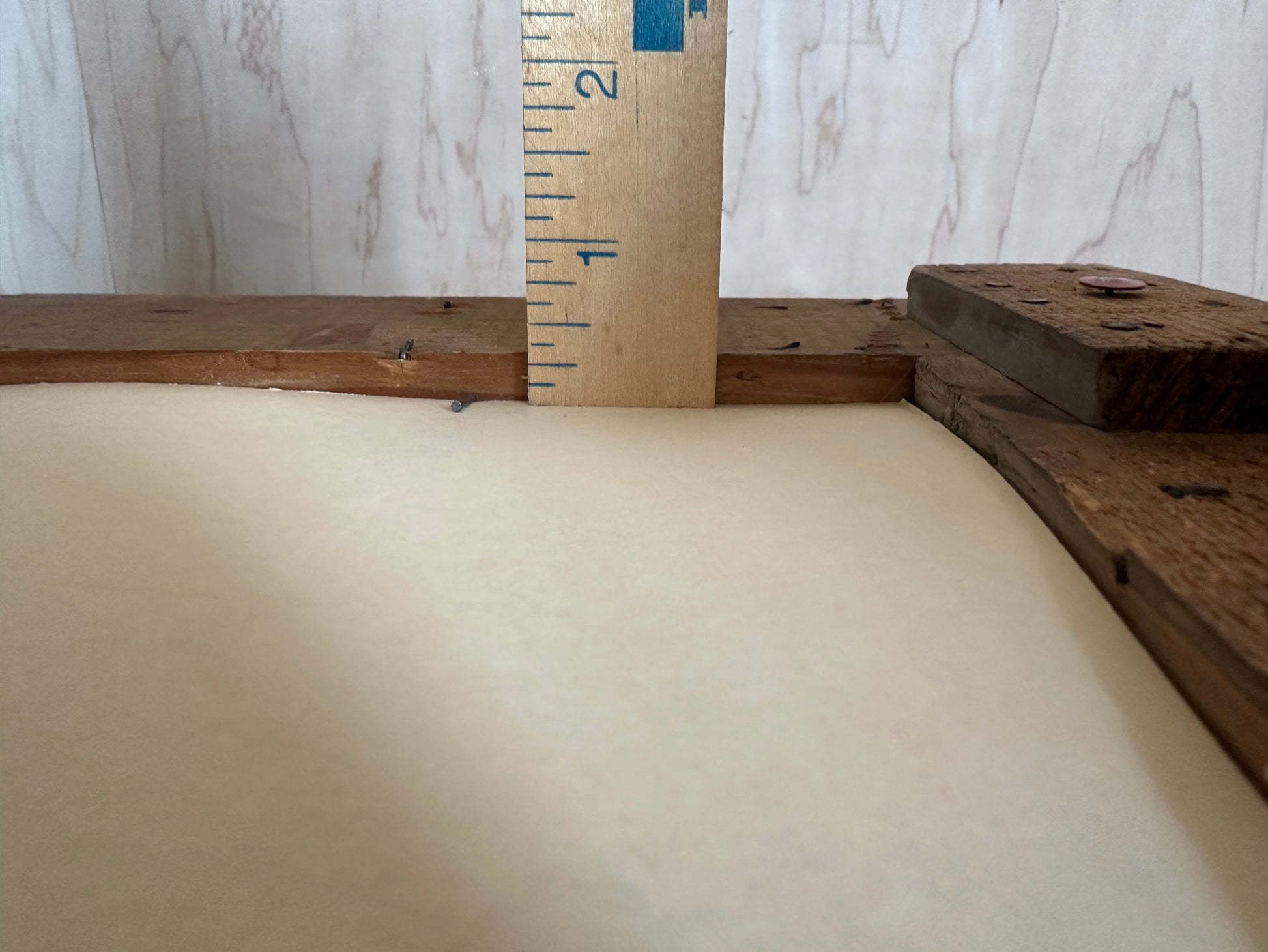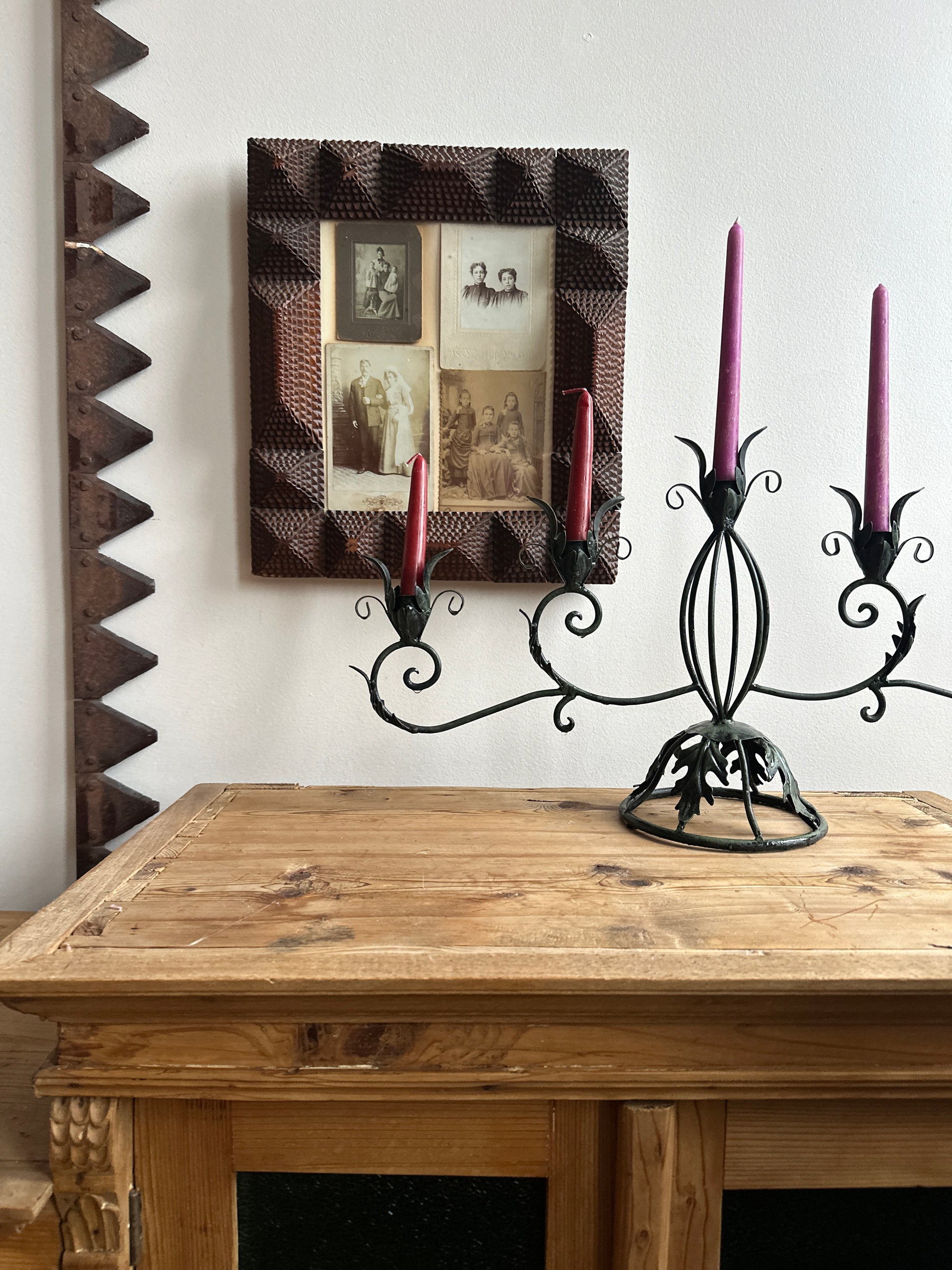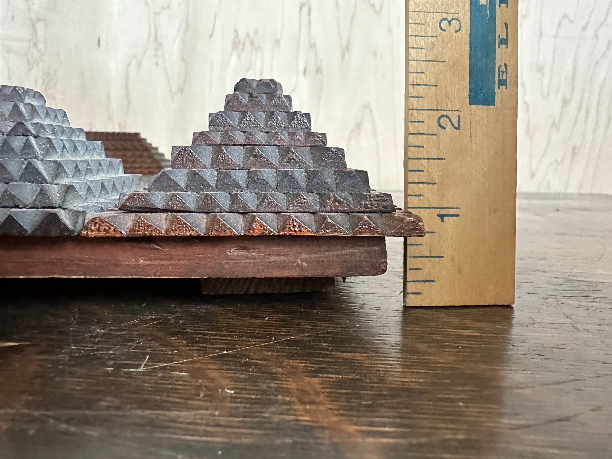 Wood Tramp style frame. Handmade. Please see pictures for condition- missing one layer on bottom left stack. Offered exactly as found with 4 antique photographs.