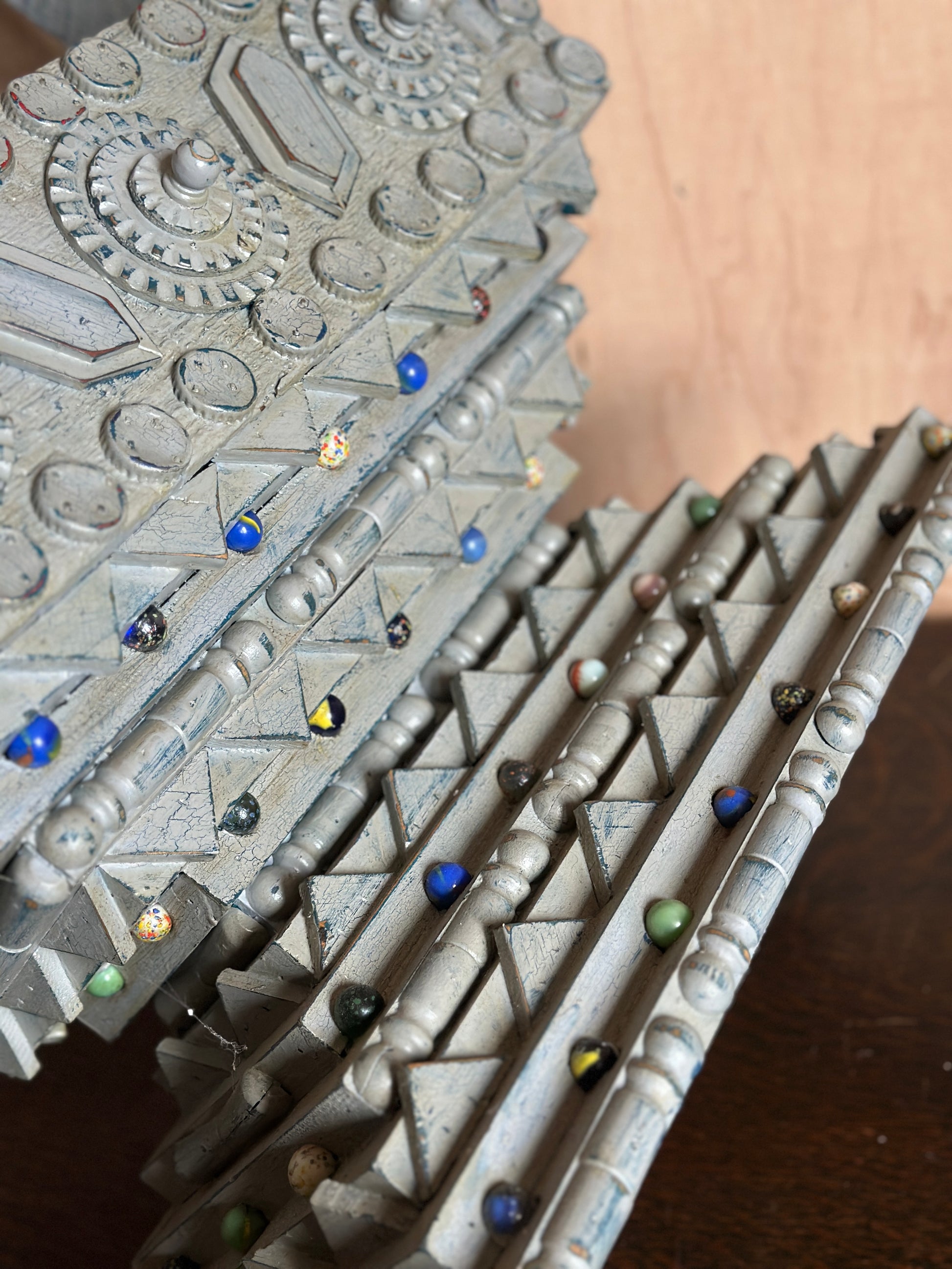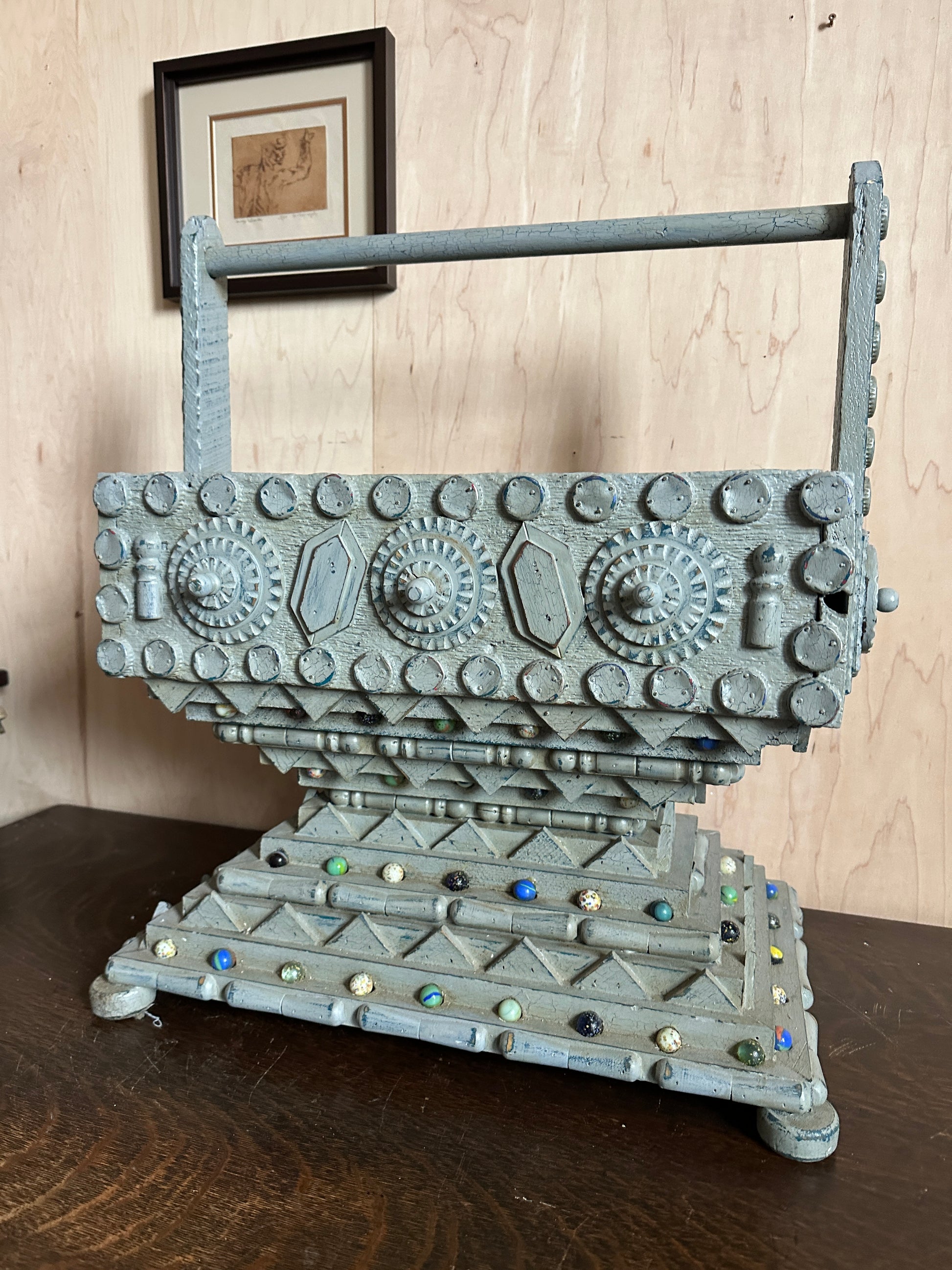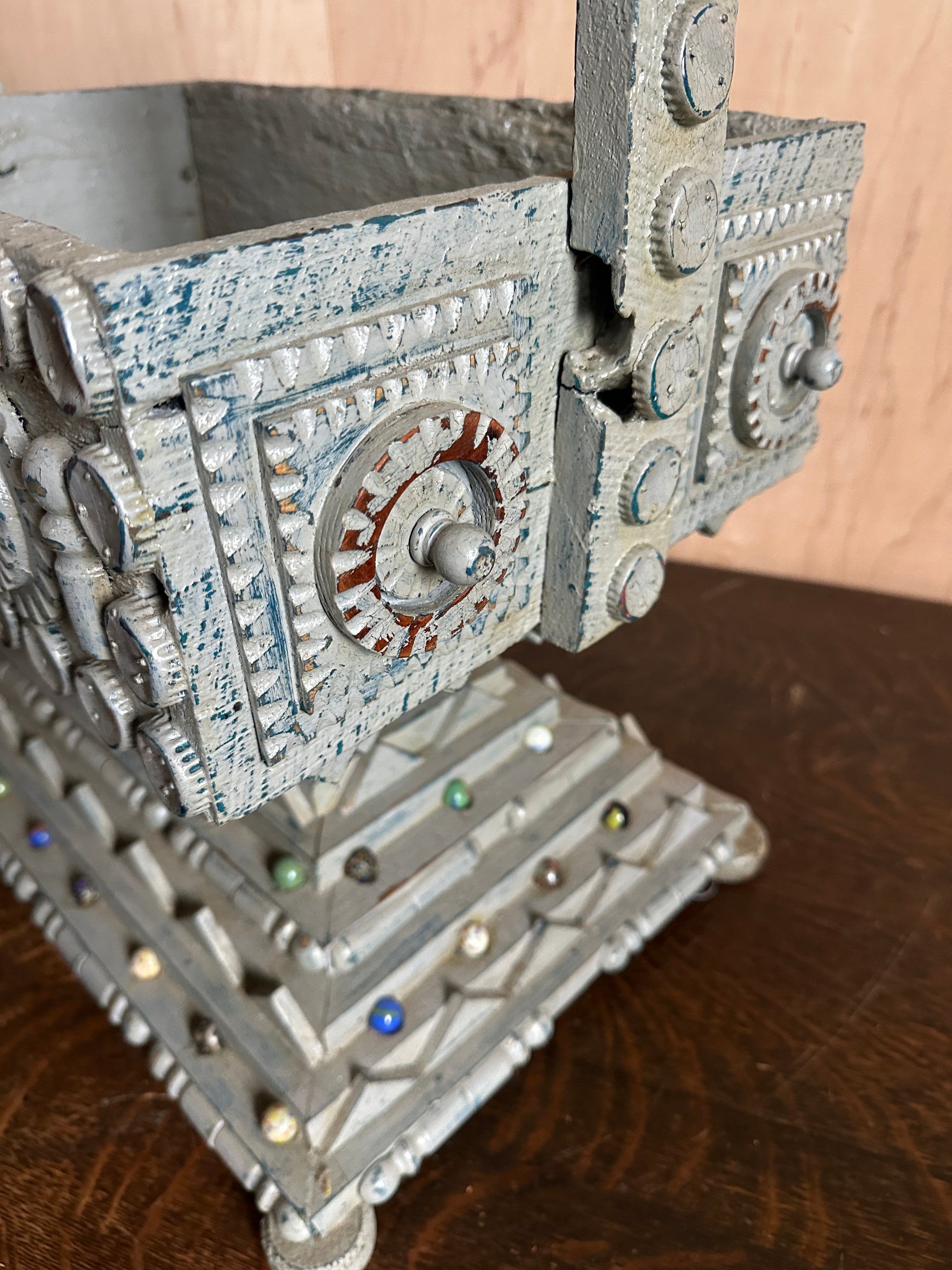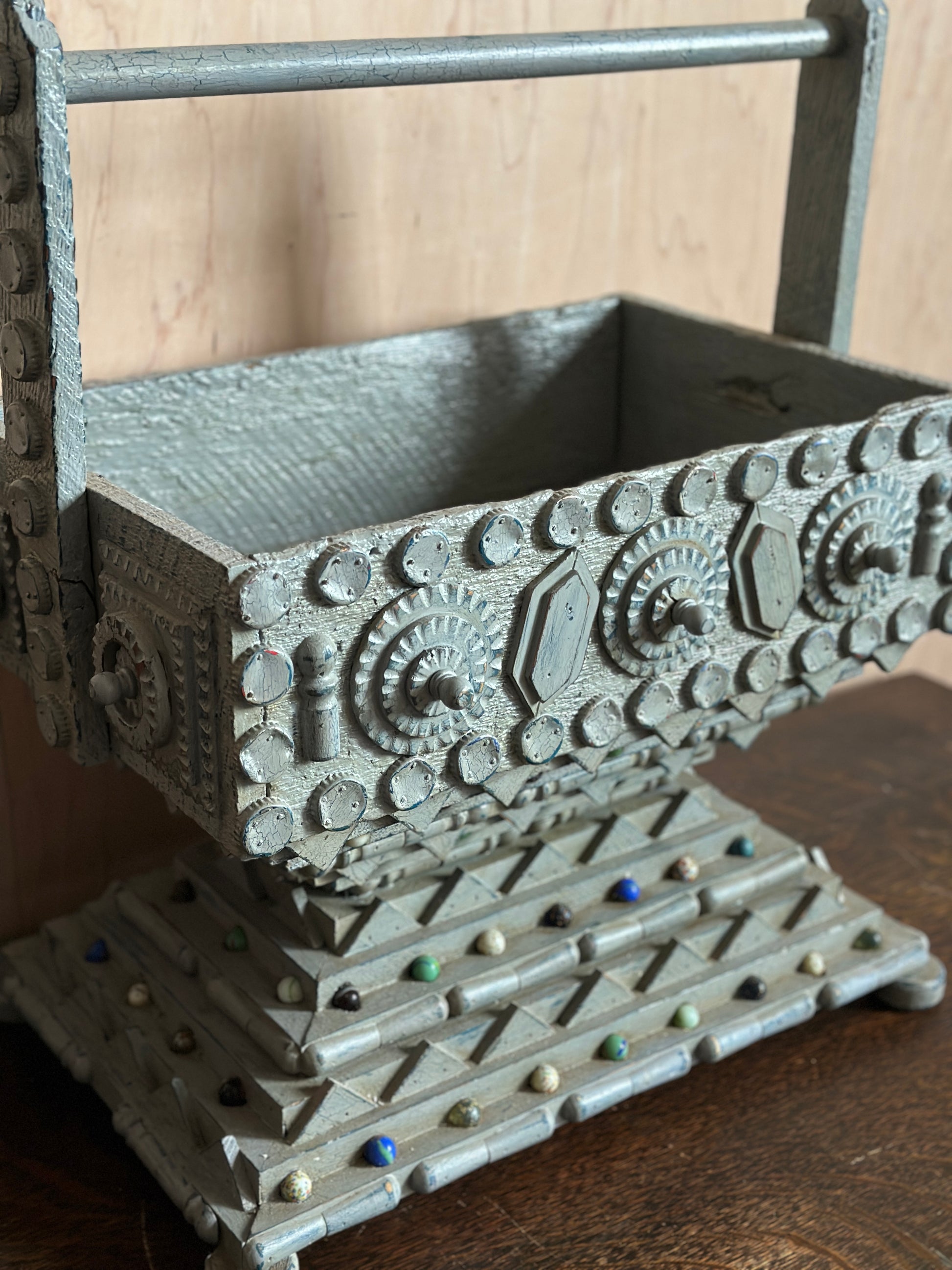 Artist made decorative wood container or planter box. Tramp style folk art with layered wood cutouts, caps, & marble details. Please see pictures closely. Repair to one handle Insured shipping within US is included. |