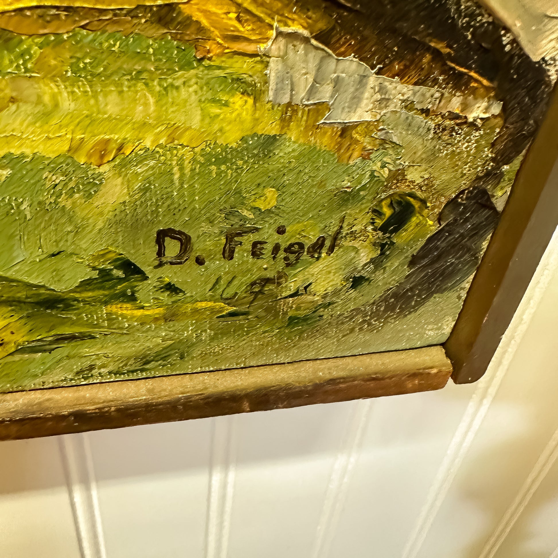 Original acrylic on canvas painting of white carnations in a vase. Signed D Feigal '64. Simple wood frame.